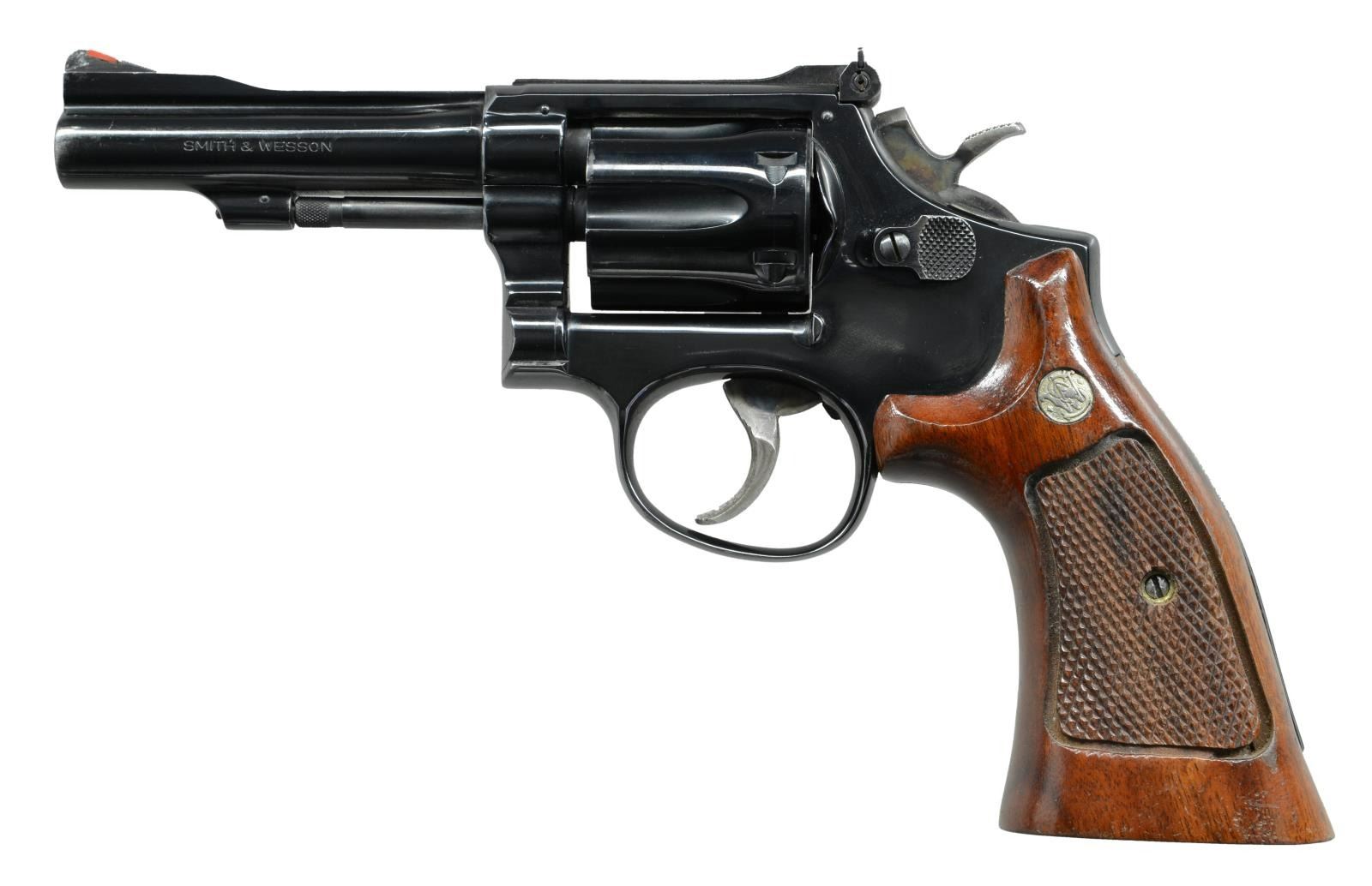 Cal .22 LR. S# 1K94689. Bbl 4". Blued finish w/ case color hardened trigger and hammer. Frame is mounted w/ 2 piece S&W medallion checkered wood grips. Ramp front sight (plastic red insert painted white) w/ adjustable square notch rear sight. CONDITION: metal components retain the majority of their original factory blue finish, exhibiting some mild wear at the muzzle and wear on the ejector rod from operation, w/ a few scattered spots of mild surface oxidation. Mirror bore w/ well defined rifling throughout. Grips show some scattered marks from handling and storage, but are otherwise sturdy and serviceable. (23-1366/MLW). MODERN. $400-600.