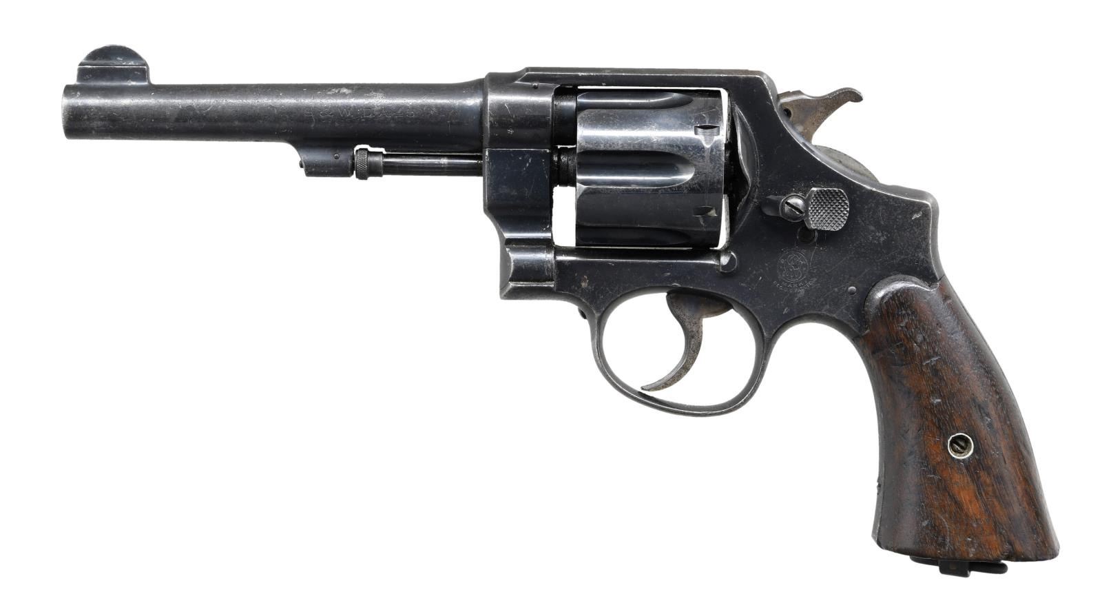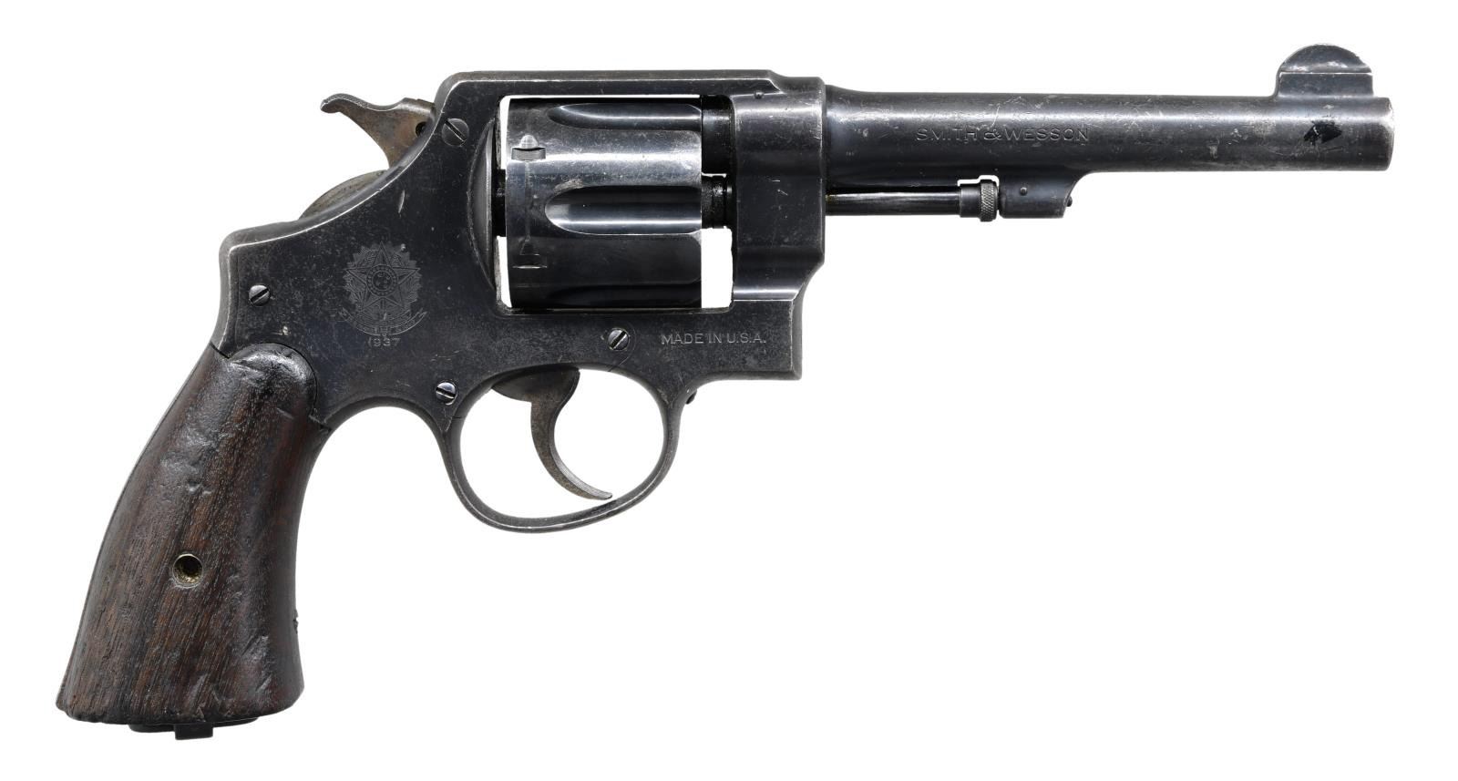 Cal. 45 ACP. S# 184562. Bbl. 5 1/2". One of about 37,000 sold to Brazil w/ their National Coat of Arms & 1937 stamped on the sideplate as well as "1929" on the backstrap. Fixed blade front w/ simple notch rear sights. S#'s on the butt & 6 shot fluted cylinder match & it appears to match on the bottom of the Bbl as well, but the import marking is through the S#. Crane & yoke "18144". Smooth wooden grips & lanyard loop in butt. CONDITION: metal retains about 50% blue w/ scattered pitting, scratches & dings throughout. Grips show moderate wear & chips. Bore is good, bright & strongly rifled w/ frosting & light pitting. (23-1020/CW). CURIO. $300-500.