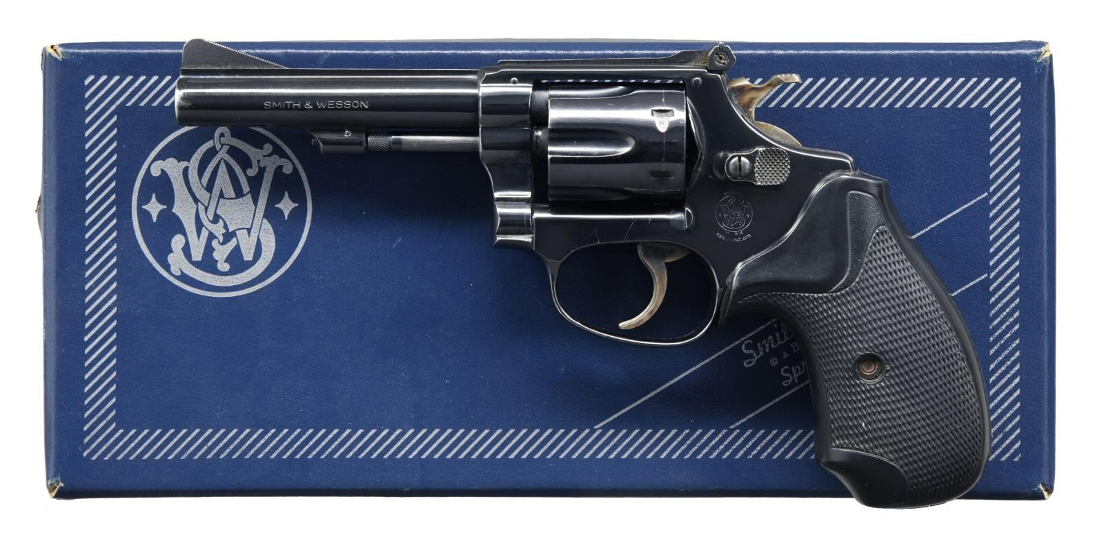 Cal. .22 LR. S# M74241. Bbl 4". Blued finish w/ a case color hardened trigger and hammer. Frame is mounted w/ a 1 piece black checkered rubber Pachmayr Presentation grip. Serrated ramp front sight w/ square notch rear sight. UNATTACHED ACCESSORIES: factory box containing cleaning rod, brushes, and factory paperwork. CONDITION: good, with metal components retaining the majority of their original factory blue finish, exhibiting some areas of mild wear, some superficial handling marks, as well as a couple spots of light surface oxidation. Very bright bore, exhibiting strong rifling throughout. Grip is slightly torn at the bottom rear seam, but is otherwise sturdy and serviceable. Box is very good. (23-1368/MLW). MODERN. $300-500.