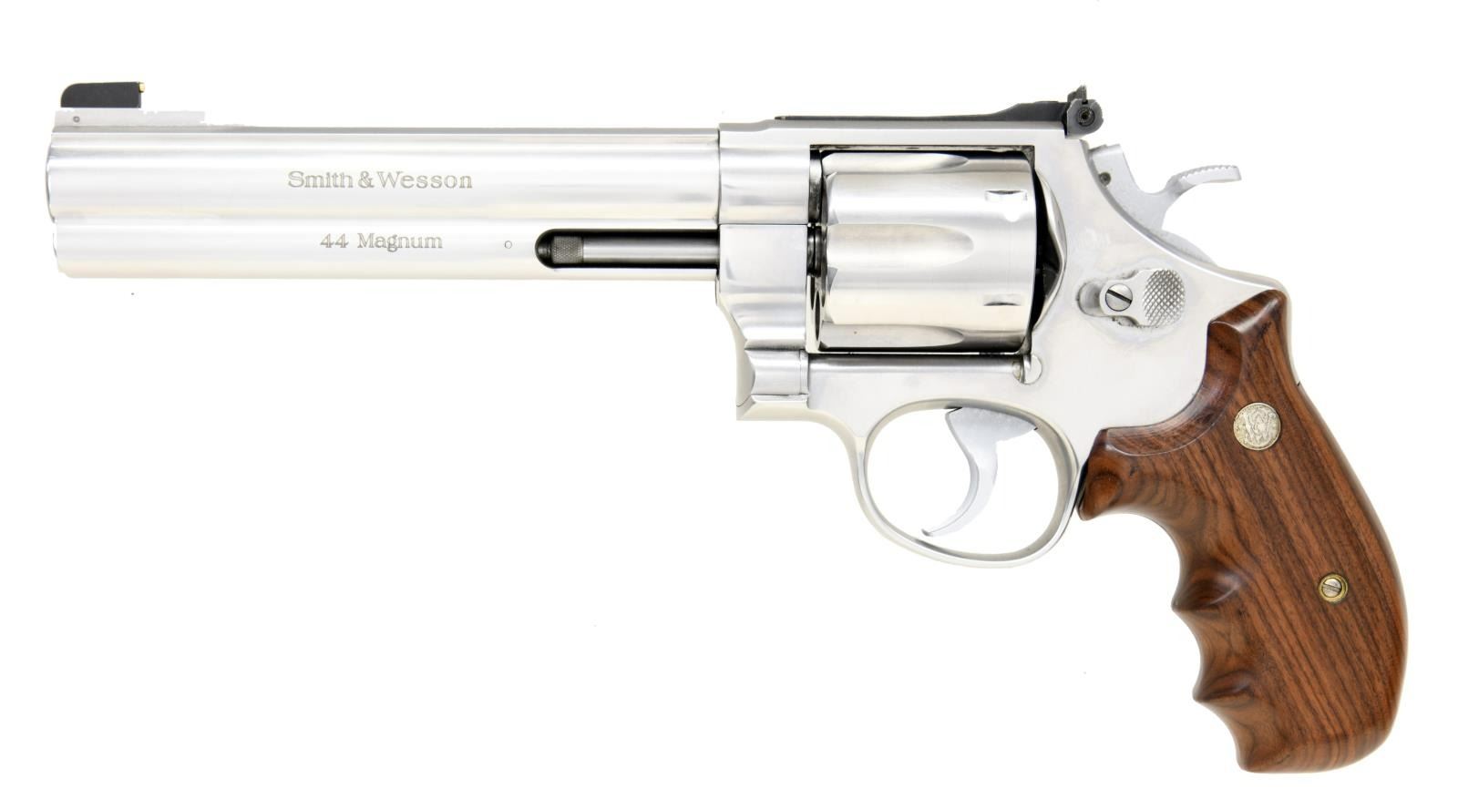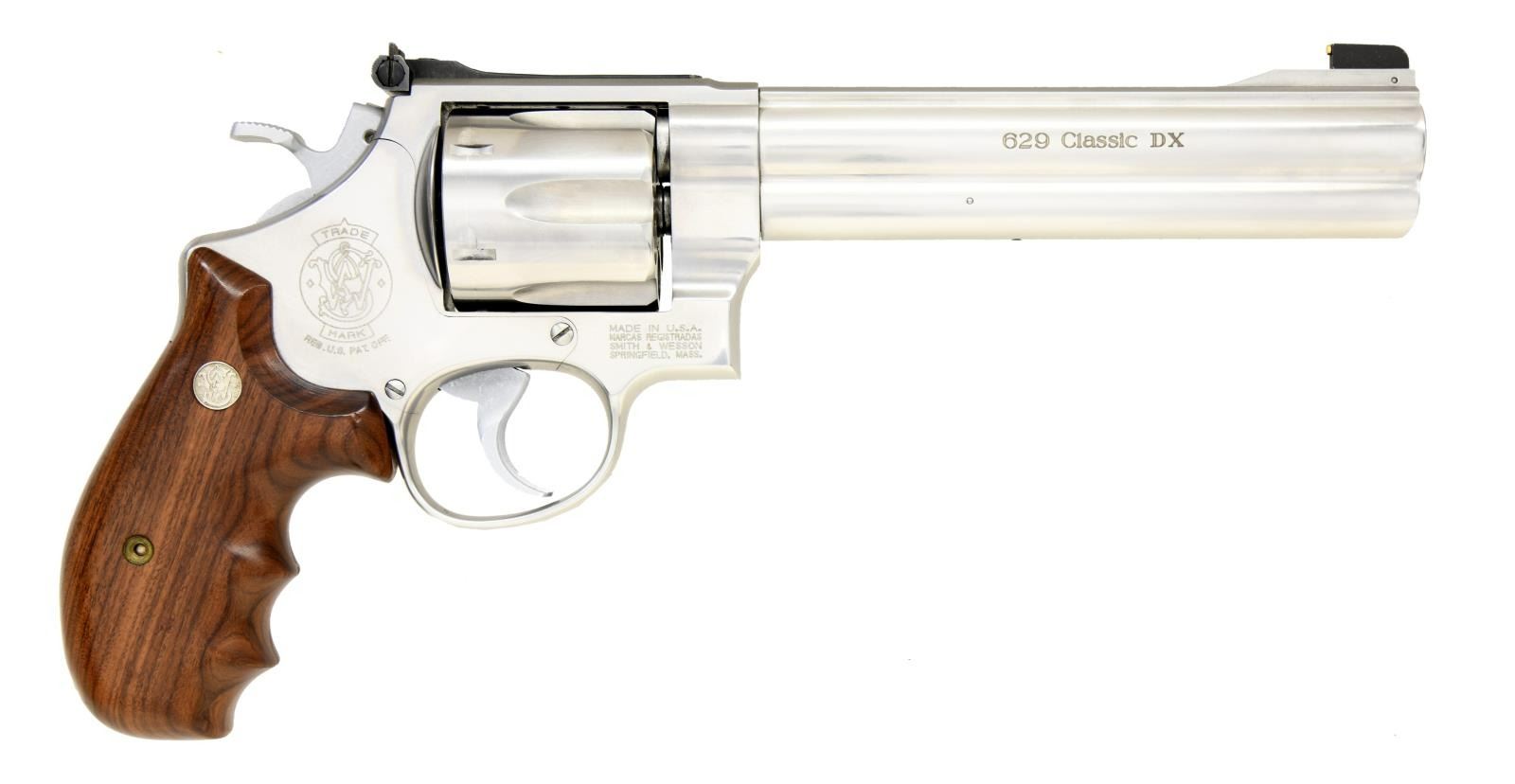 Cal. 44 Mag. S# BKR3249. Bbl. 6 1/2". Similar to the 629 Classic, this revolver was originally offered w/ 2 sets of grips, 5 interchangeable front sights & a test target. Revolver has one set of grips & front sights w/ no target or box. Fixed ramp front & adjustable rear sights. Stainless construction & smooth wooden finger groove S&W monogrammed grips. CONDITION: metal shows light usage marks & fine scratches. Grips also show light scratches & a few dents. Bore is very good plus, bright & strongly rifled. (23-1055/CW). MODERN. $700-1,000.