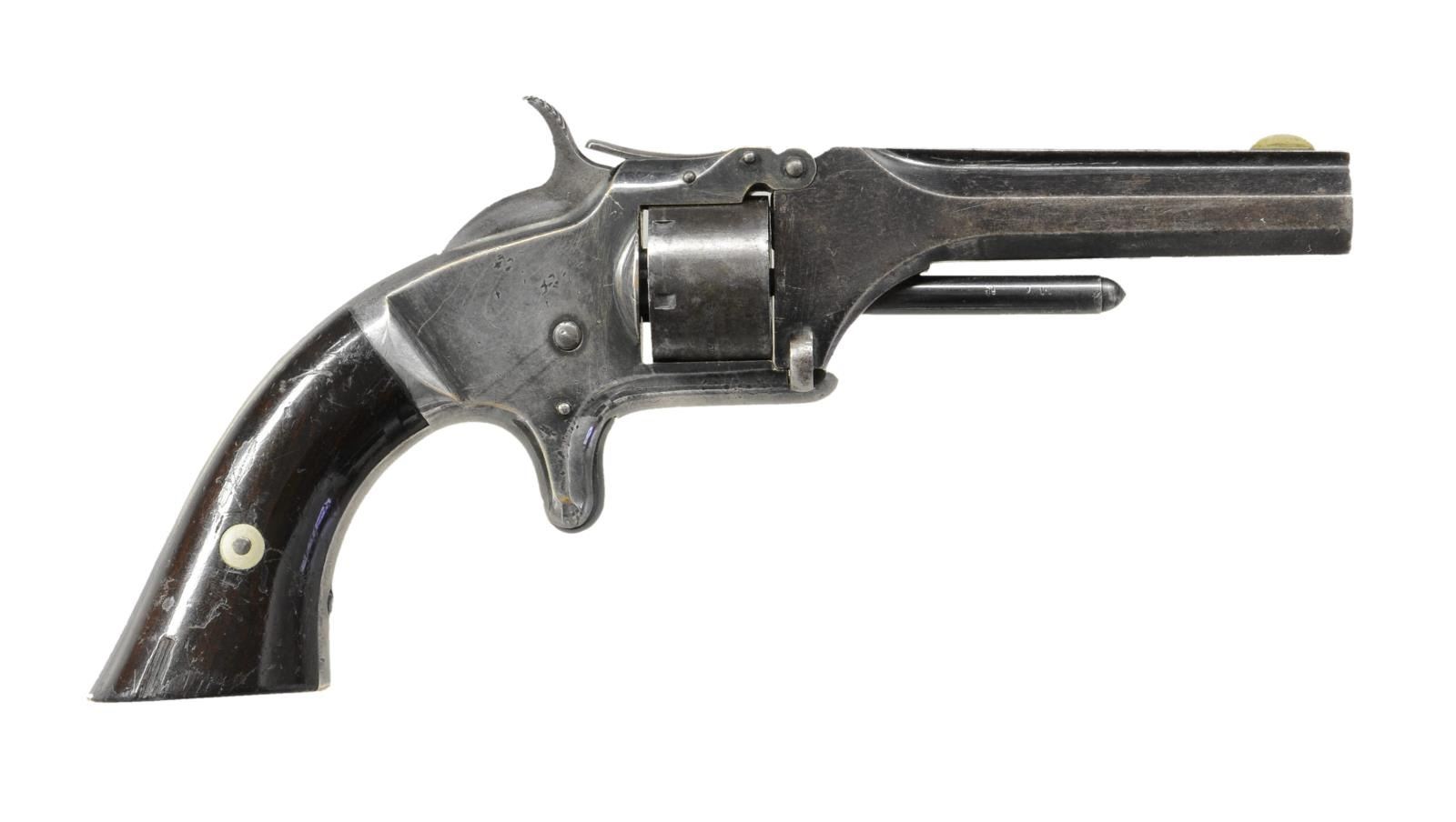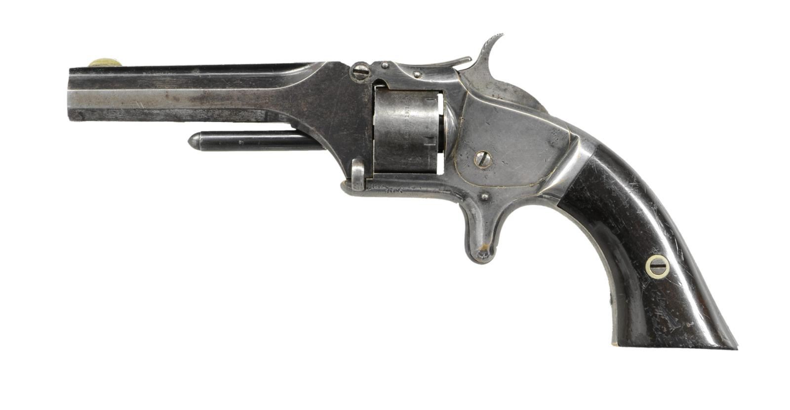 Cal. 22 RF. S# 89491. Bbl. 3 3/16". Similar to 1st issue but flat sided frame & irregular shaped sideplate. Fixed blade front & simple notch rear sights. S# on grips stamped match frame. Blued finish & 7 shot cylinder w/ patent dates. CONDITION: metal retains about 20% blue mostly in protected/sheltered areas w/ balance a gunmetal gray along w/ dings, dents & scratches. Grips show flaking finish w/ some chipping to the wood. Bore has patches of brightness & strong rifling, but the balance is pitted & dark. PROVENANCE: From the Lifelong Collection of Glen E. Mattox. (01-22441/CW). ANTIQUE. $300-500.