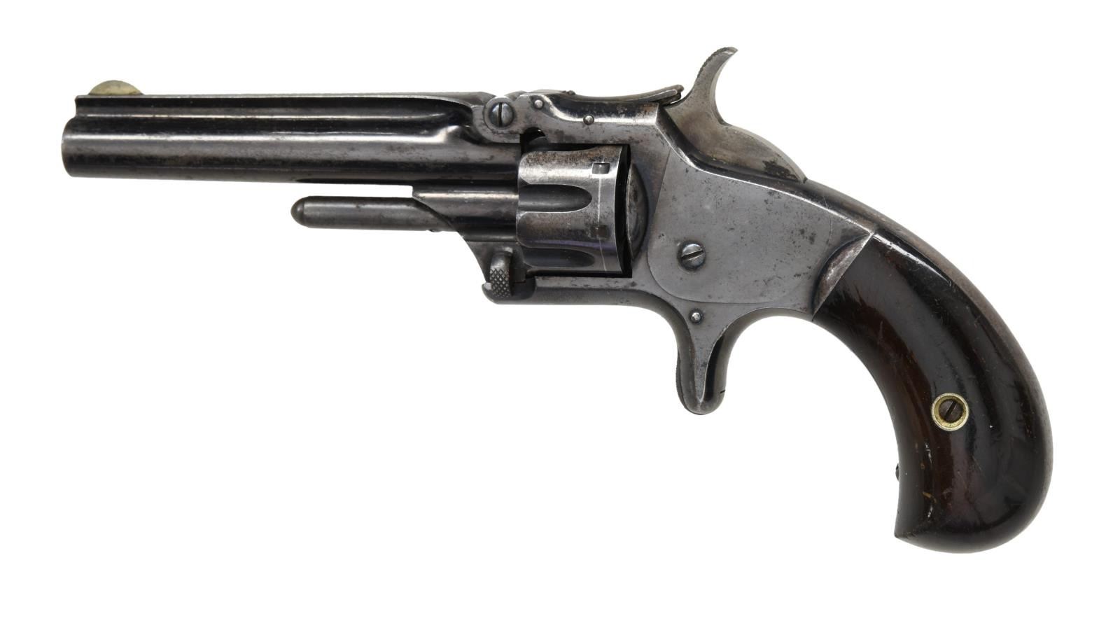 Cal. 22 RF. S# 108418. Bbl. 3 3/16". Fine late 3rd issue w/ fixed blade front & simple notch rear sights. Round Bbl., fluted unmarked cylinder & matching S# birds head walnut grips. CONDITION: metal retains about 80% original finish on frame & Bbl. w/ about 50% on the cylinder along w/ some older corrosion. Grips retain strong finish w/ scattered older scratches & dings. Bore is mostly very good, bright & strongly rifled w/ last inch of Bbl. pitted. PROVENANCE: From the Lifelong Collection of Glen E. Mattox. (01-22440/CW). ANTIQUE. $300-500.
