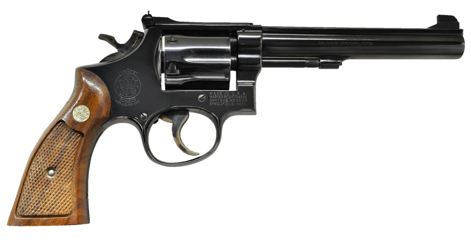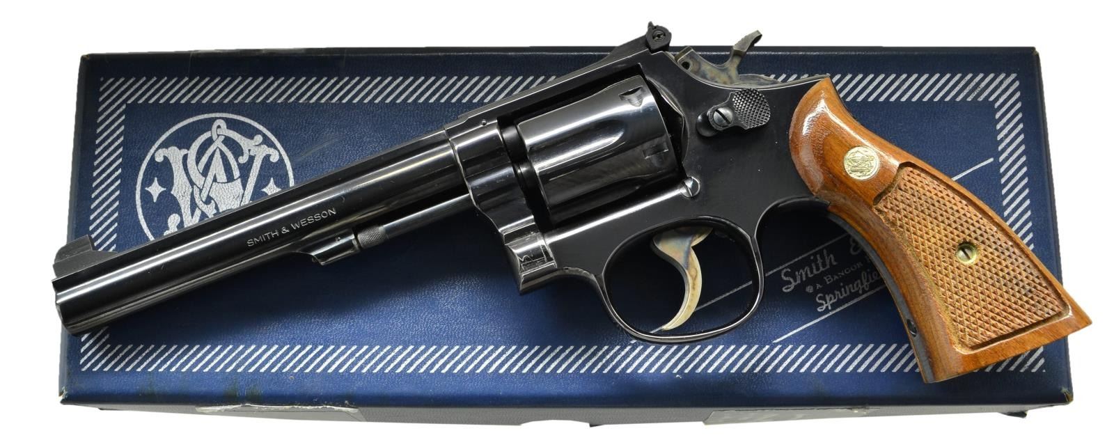 Cal. 38 Spl. S# 1K98426. Bbl. 6" pinned & ribbed w/ Patridge front sight plus frame mounted Micrometer rear. Mfg. 1971 (1947-1981) as K-38 Target Masterpiece w/ blued finish & checkered walnut Magna grips (numbered to another revolver), Case colored standard hammer & trigger. UNATTACHED ACCESSORIES: matching numbered factory 2 piece blue box w/ paperwork & tools; wide clear packing tape & orange sticker added. CONDITION: all aspects near excellent w/ hint of cyl. turn line; very minimal evidence of firing. (22-4439/NW). CURIO. $650-900.