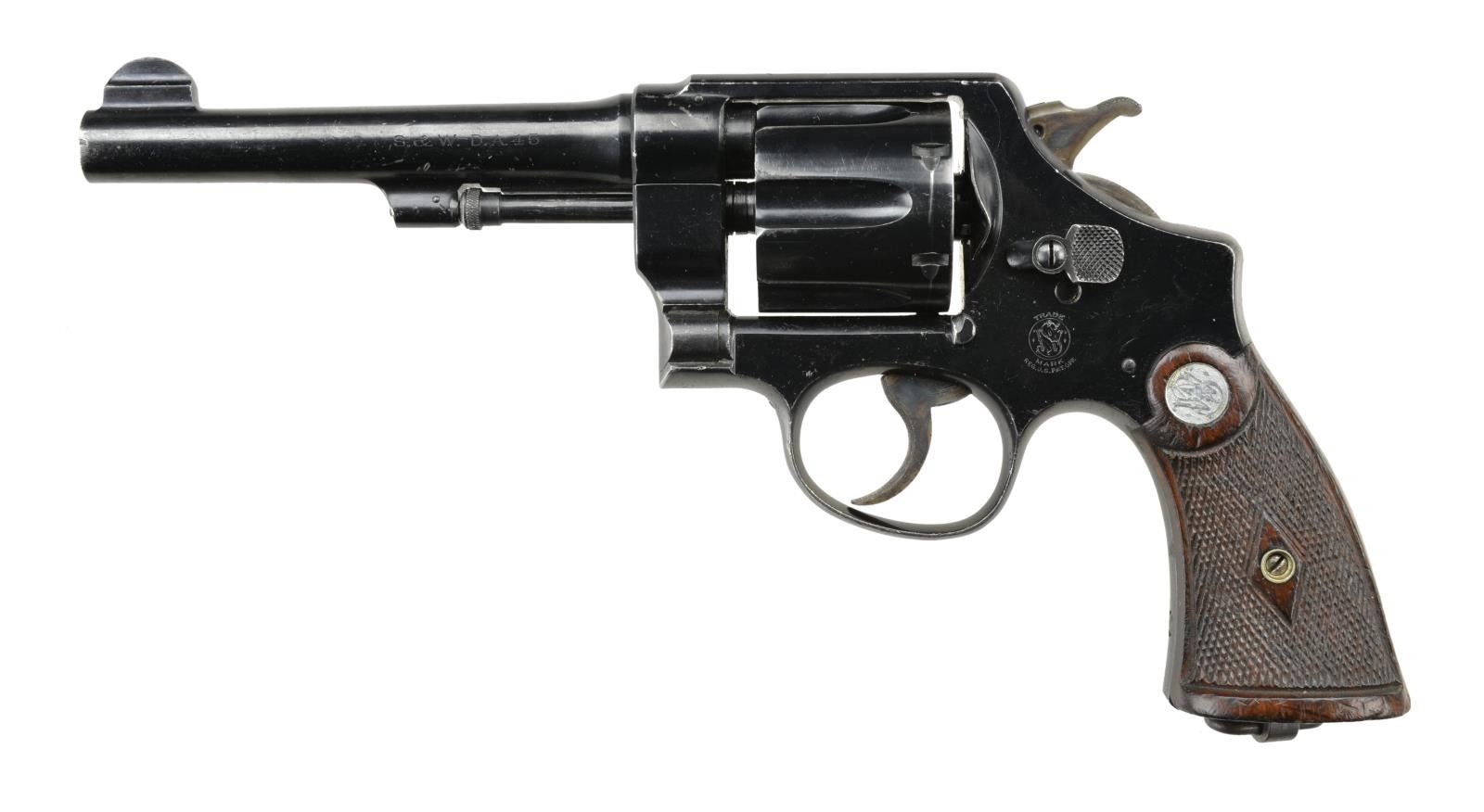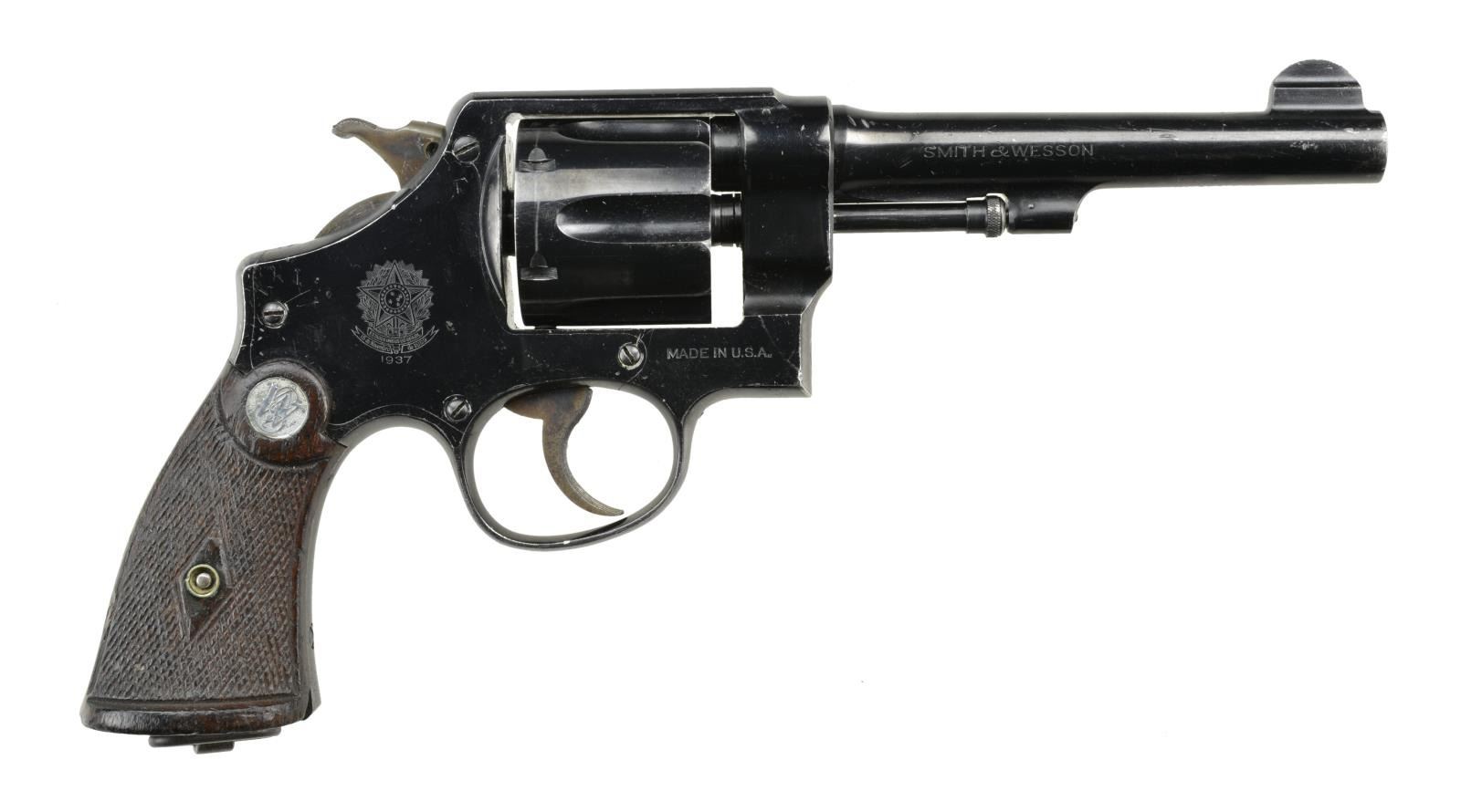 Cal. 45 ACP S#194385. Bbl. 5" w/ import marking. Matching numbers on bbl. cyl. & extractor. 5 screw frame w/ Brazilian crest on right side plate. Right front of frame marked "MADE IN U.S.A.". S&W logo present underneath cyl. latch. Backstrap has Brazilian number 12401. Mainspring is a non S&W replacement w/ shortened strain screw giving light trigger pull in SA mode. DA mode has a slight hitch. Checkered walnut grips. CONDITION: grips show overall wear, dents & scratches. Hammer & trigger retain generous amounts of their original case colors w/ some light oxidation on trigger. Balance of metal retains 70% original blue w/ cyl. drag line, scattered marks & scratches & a couple small spots of pitting on front strap. Very good bore. (22-2415/MJC). CURIO. $300-500.