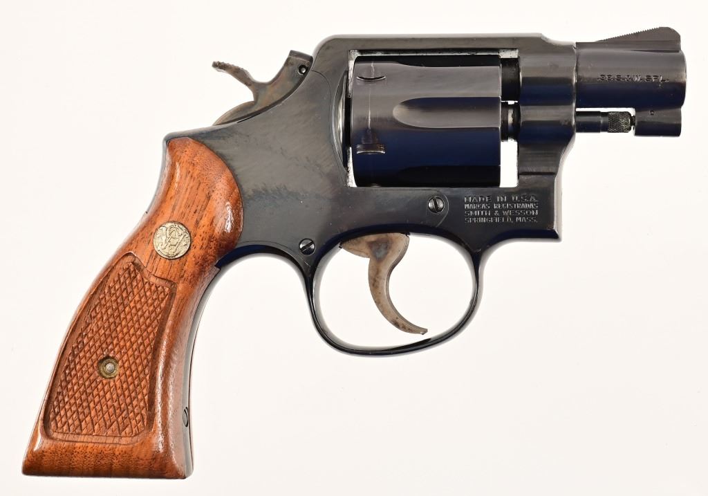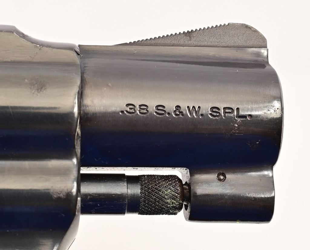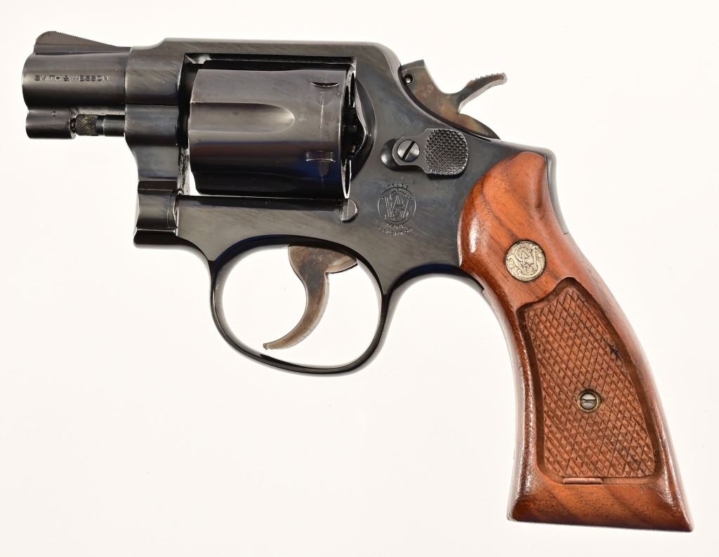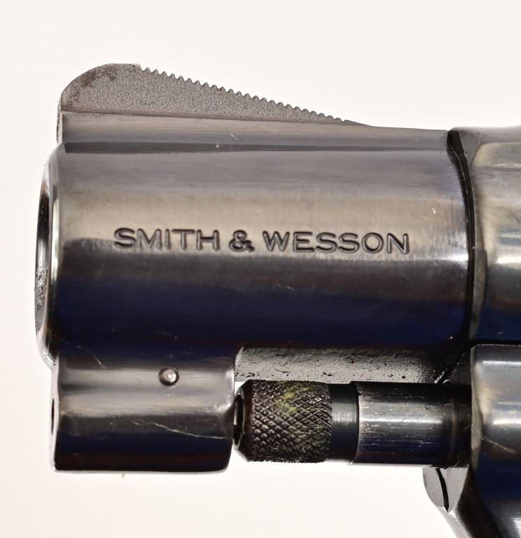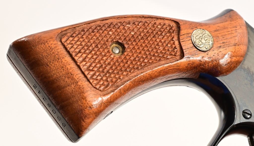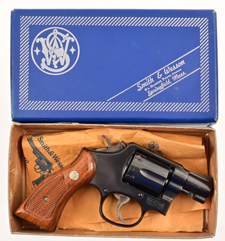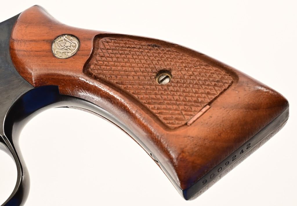 Square butt 3-screw side plate, 2" barrel, blue finish, checkered wood grips. Serial 9D09242 , excellent condition with original box.