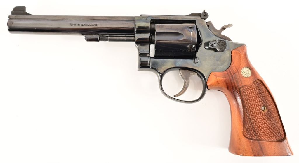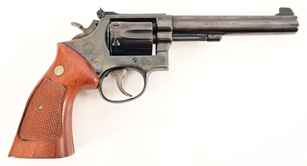 Serial K527171. 5 7/8" barrel, blue finish, checkered wood grips. Standard trigger & hammer.