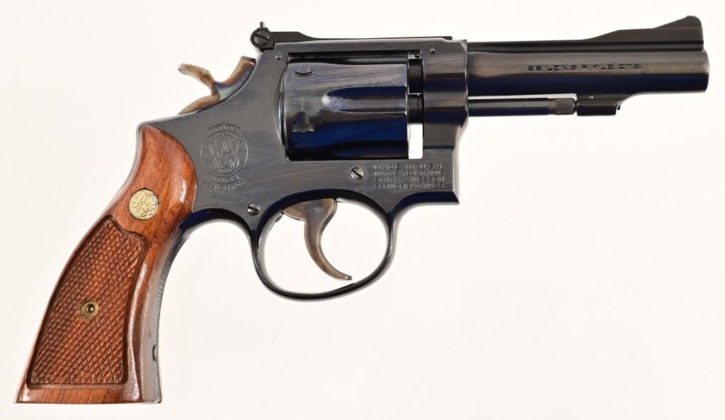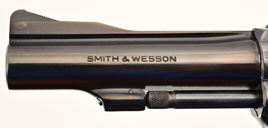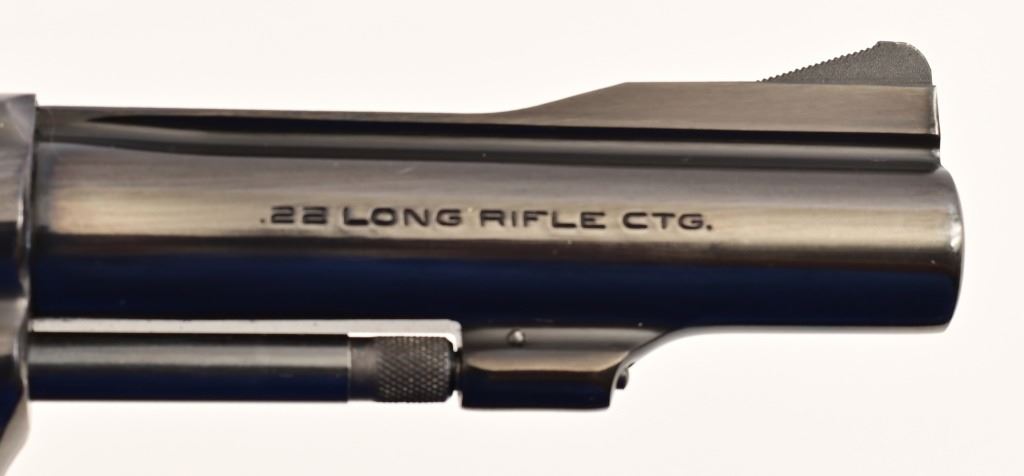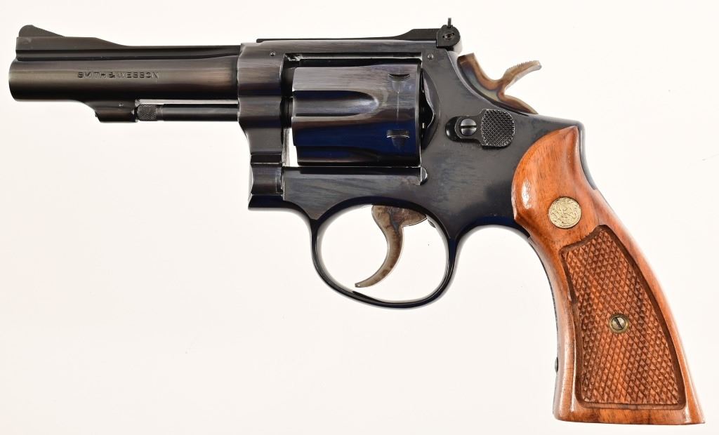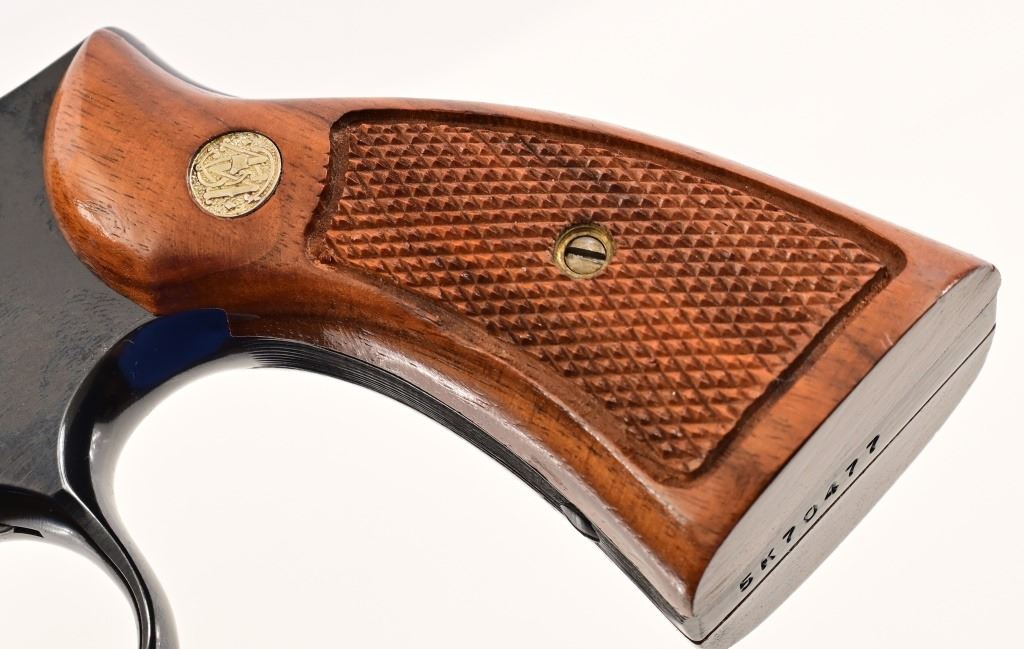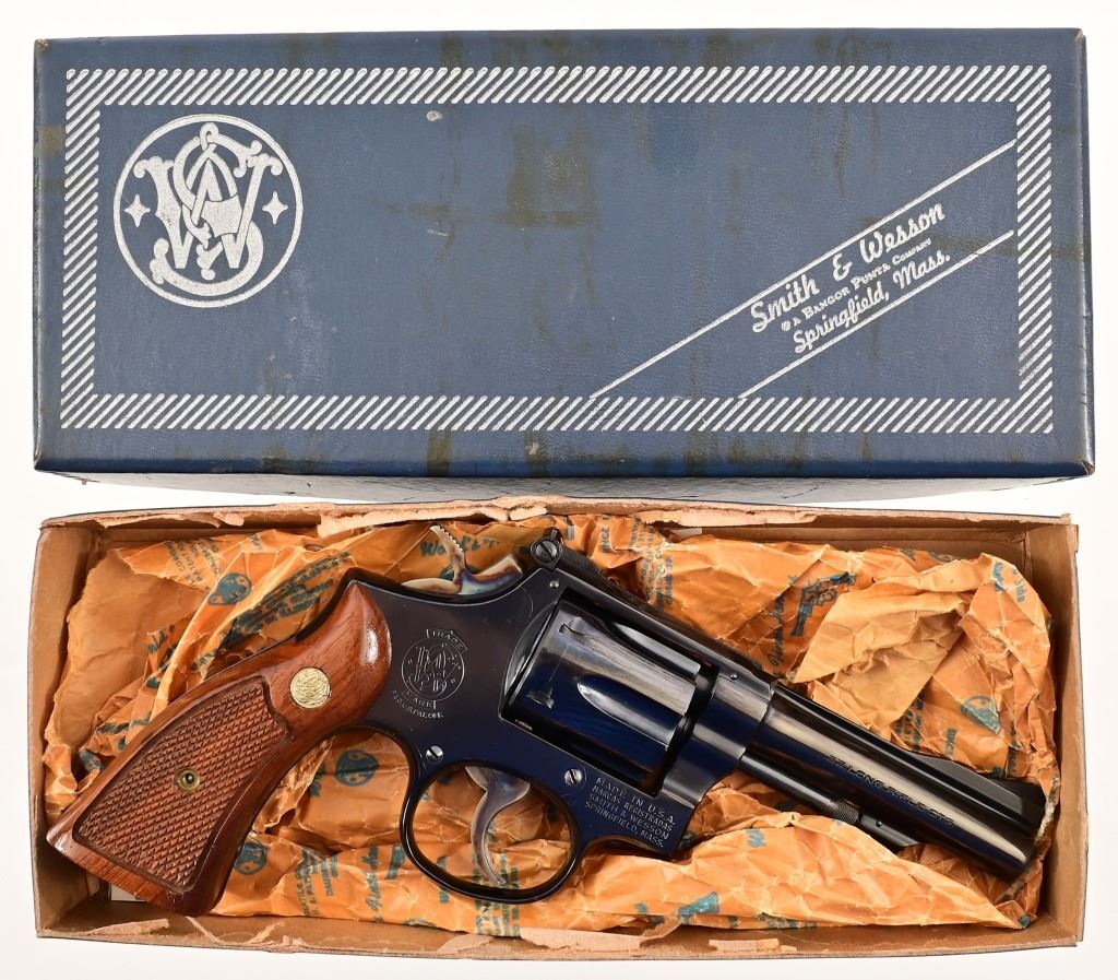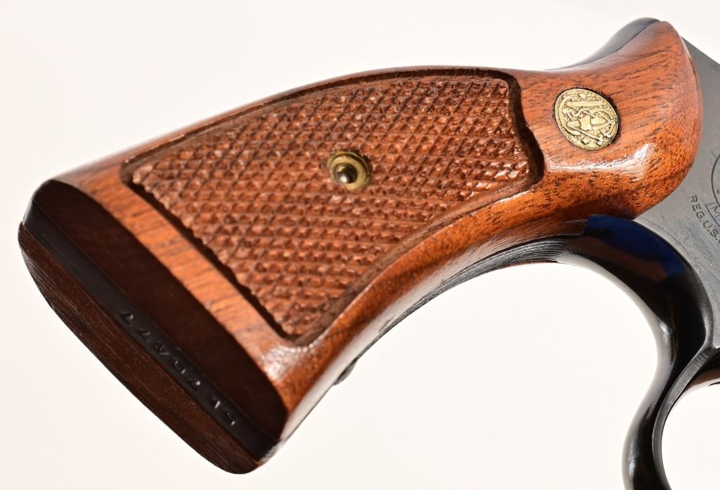 4' pinned barrel, square butt, 4 screw side plate. Blue finish, checkered wood diamond delete grips. SN 5K70477, near mint in original box.