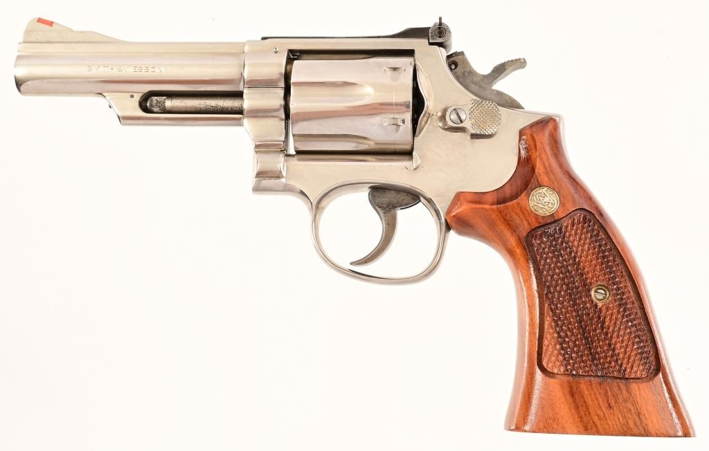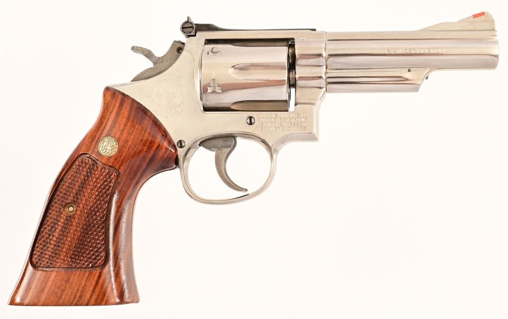 4" pinned barrel, 4 screw side plate, original factory nickel finish. Target sights, standard trigger & hammer. checkered wood grips. Serial 42K5756, original box & paperwork.
