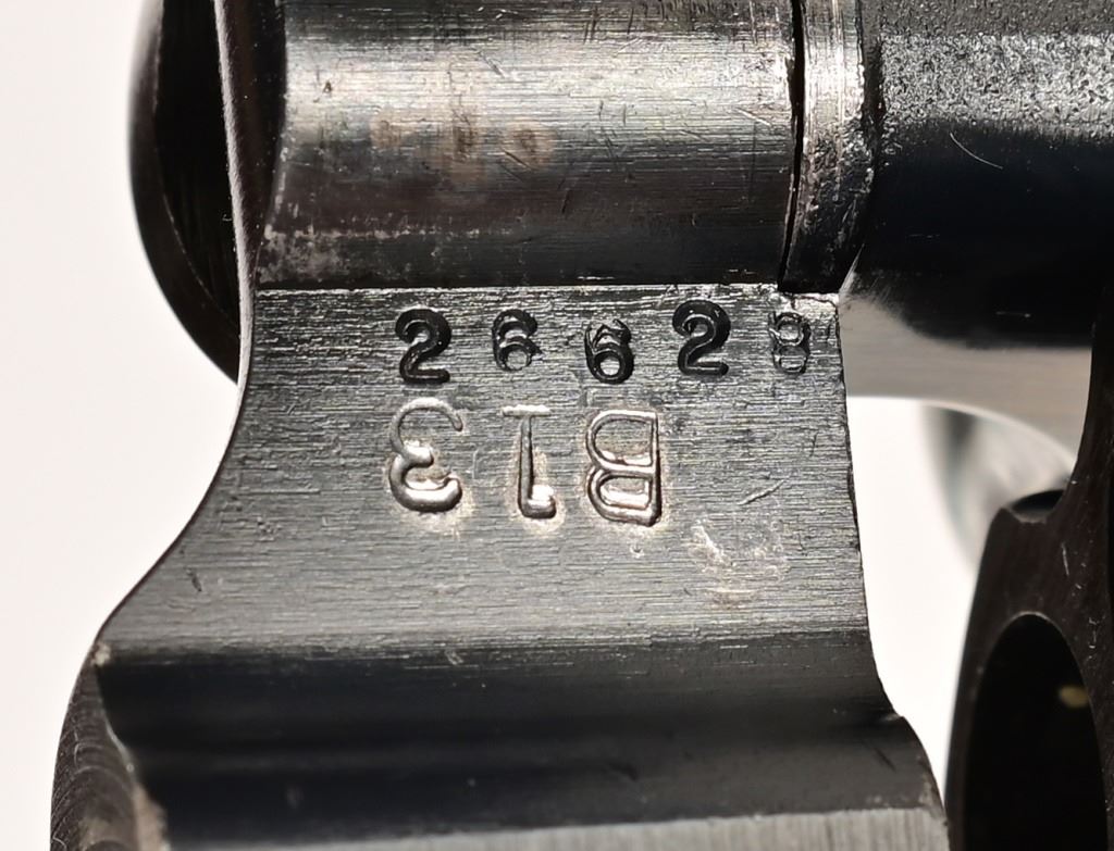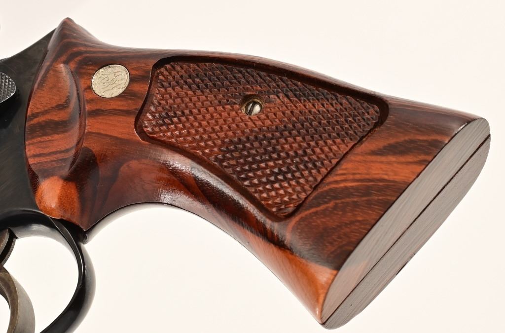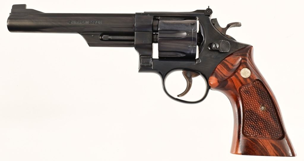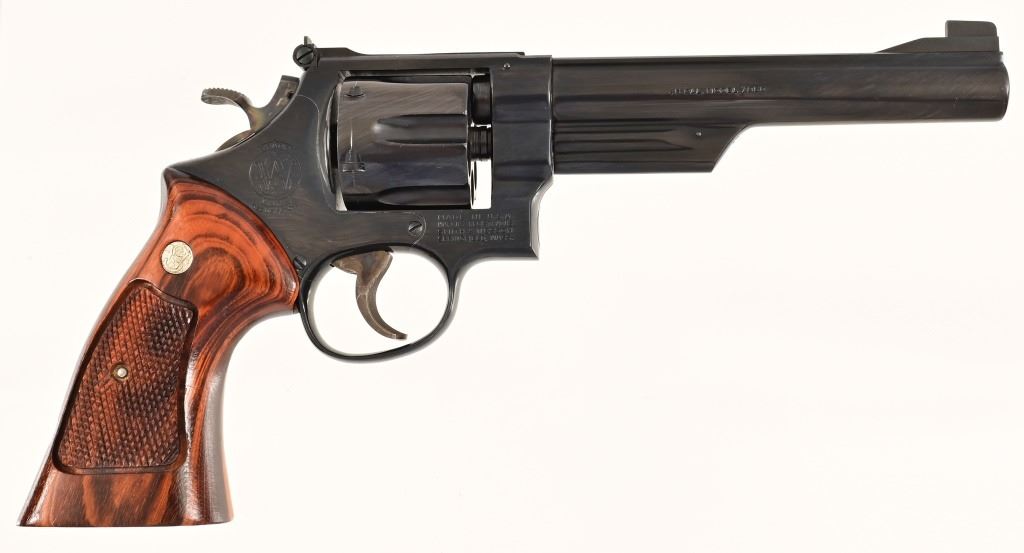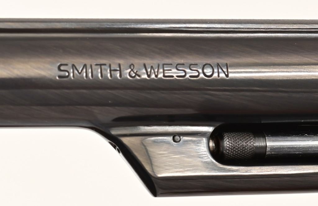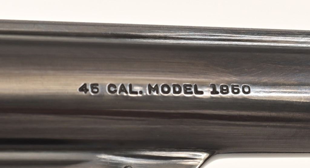 Factory mis-stamped Model 1955, stamped "1950". Rare variation referenced in the book "Standard Catalog of Smith & Wesson", reportedly around 100-1500 were shipped with barrels incorrectly roll-marked ".45 Cal Model 1950". 6.5" barrel, blue finish, checkered grip.s Excellent condition. Sn N339570, manufactured 1976.