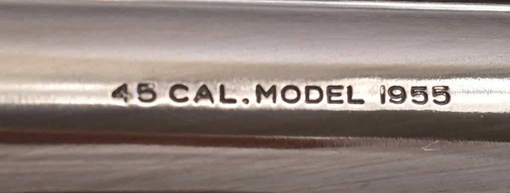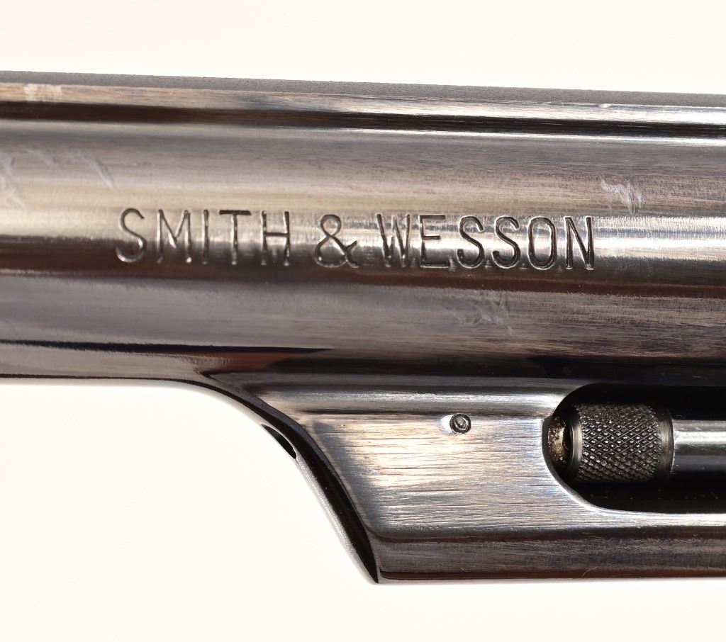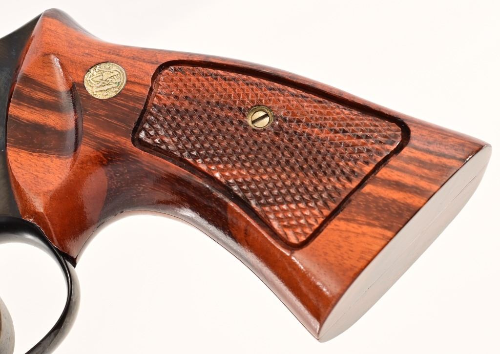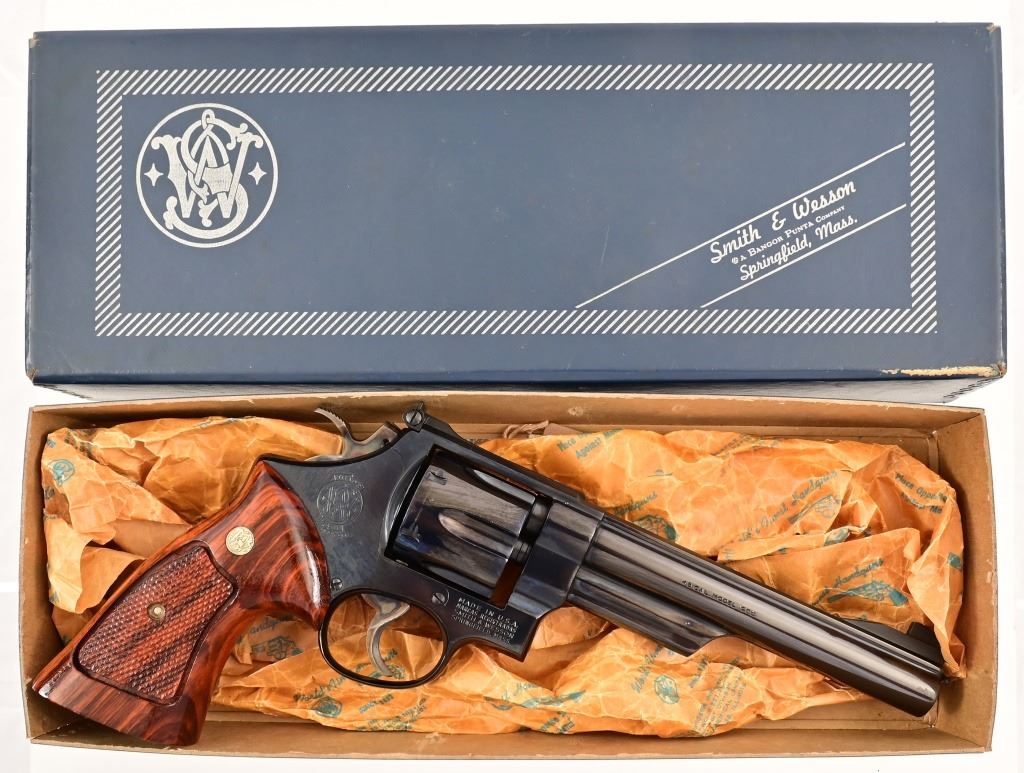 6.5" heavy ribbed/pinned barrel, 4 screw side plate. Excellent blue finish, with checkered wood grips. Serial N67559, circa 1979-1980 with original box, paperwork, and ACP clips.
