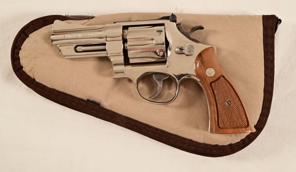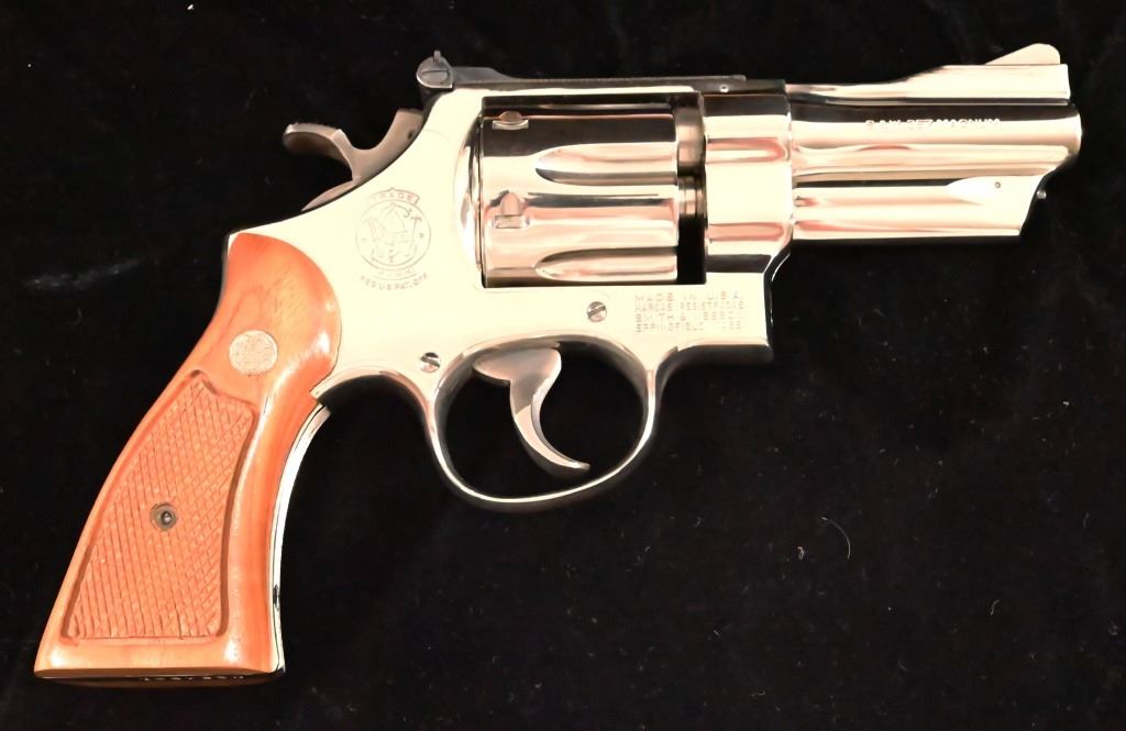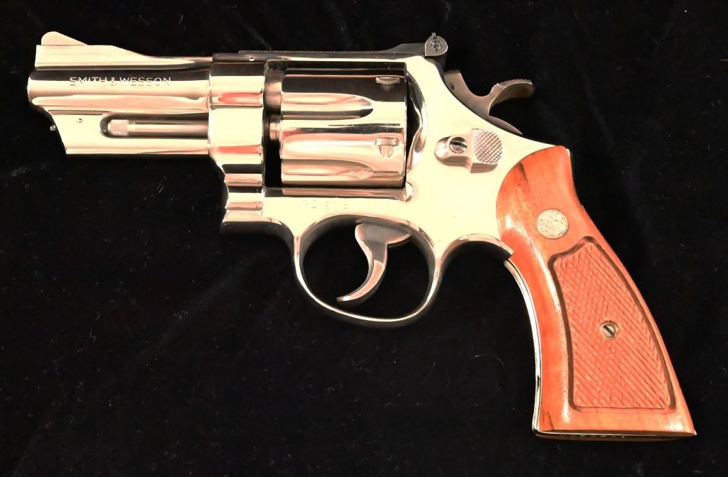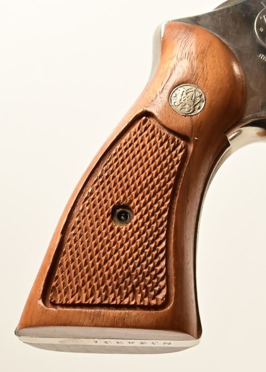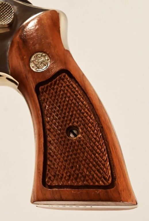 S/N N354531 produced for the Austin Police Department. This gun features 3.5" barrel, nickel finish, with checkered wood grips. Left side of receiver engraved with "APD 515". Target hammer, trigger, and sights.