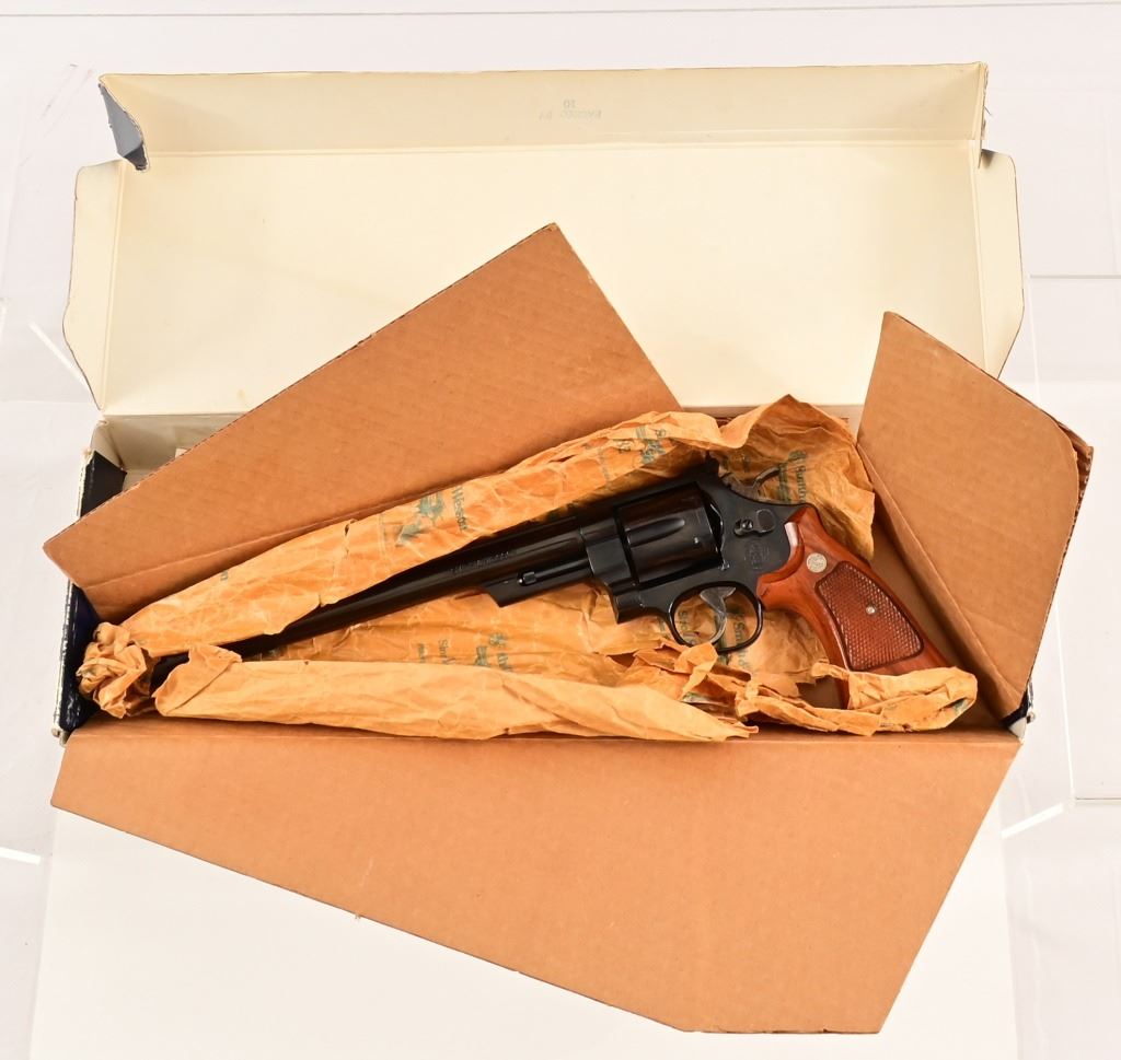 10.5" barrel, blue finish, checkered wood grips marked 1980. Target sights, trigger, & hammer. With factory box, tools, & paperwork. SN BFJ3246