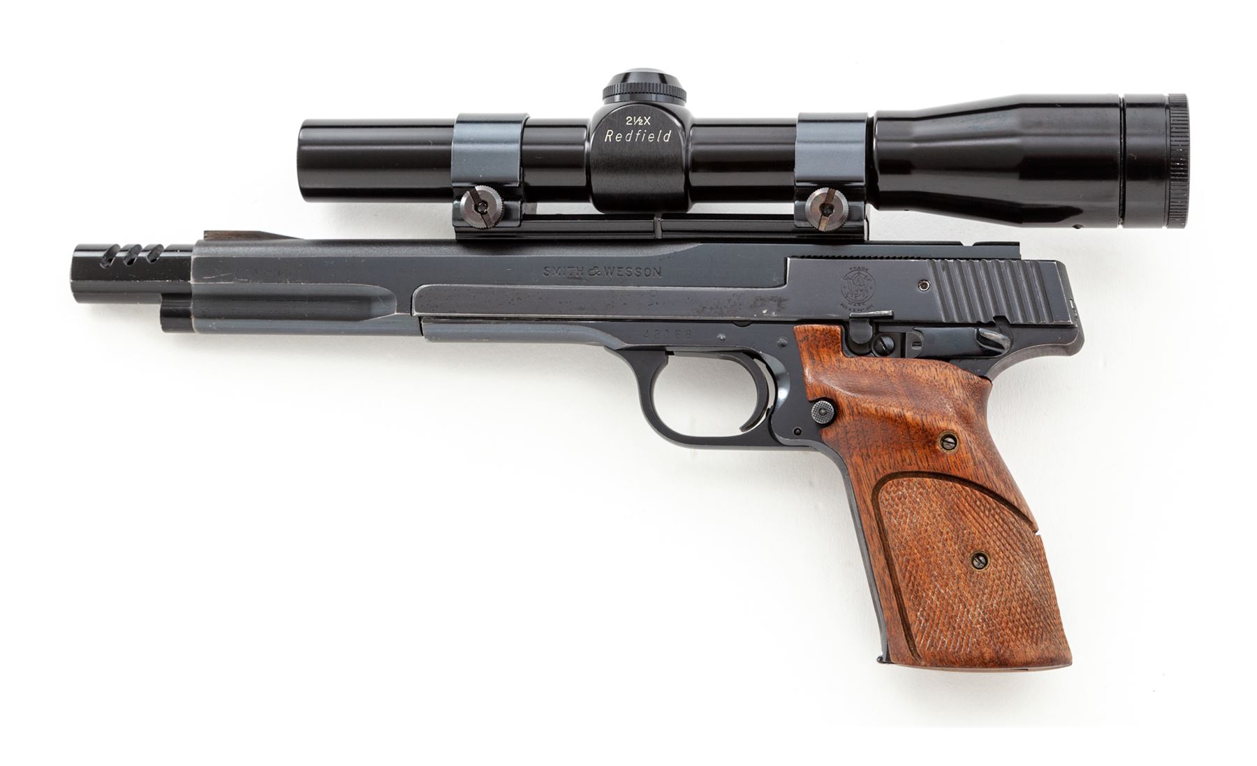 Smith & Wesson Model 41 Semi-Automatic Target Pistol, #41268, .22 LR cal., 7'' barrel with compensator, blue finish, factory checkered walnut grips, with two (2) factory magazines. Topped with a Redfield 2.5X EER scope. Condition is very good as modified. Front and rear sights have been removed. Approx. 90% thinning blue remains. Grips have been altered for a smaller hand; checkers with near heavy wear. Good action, bright bore. Est.: $600-$800. (Modern/PPT)