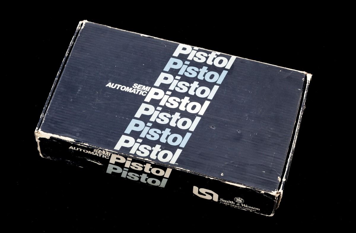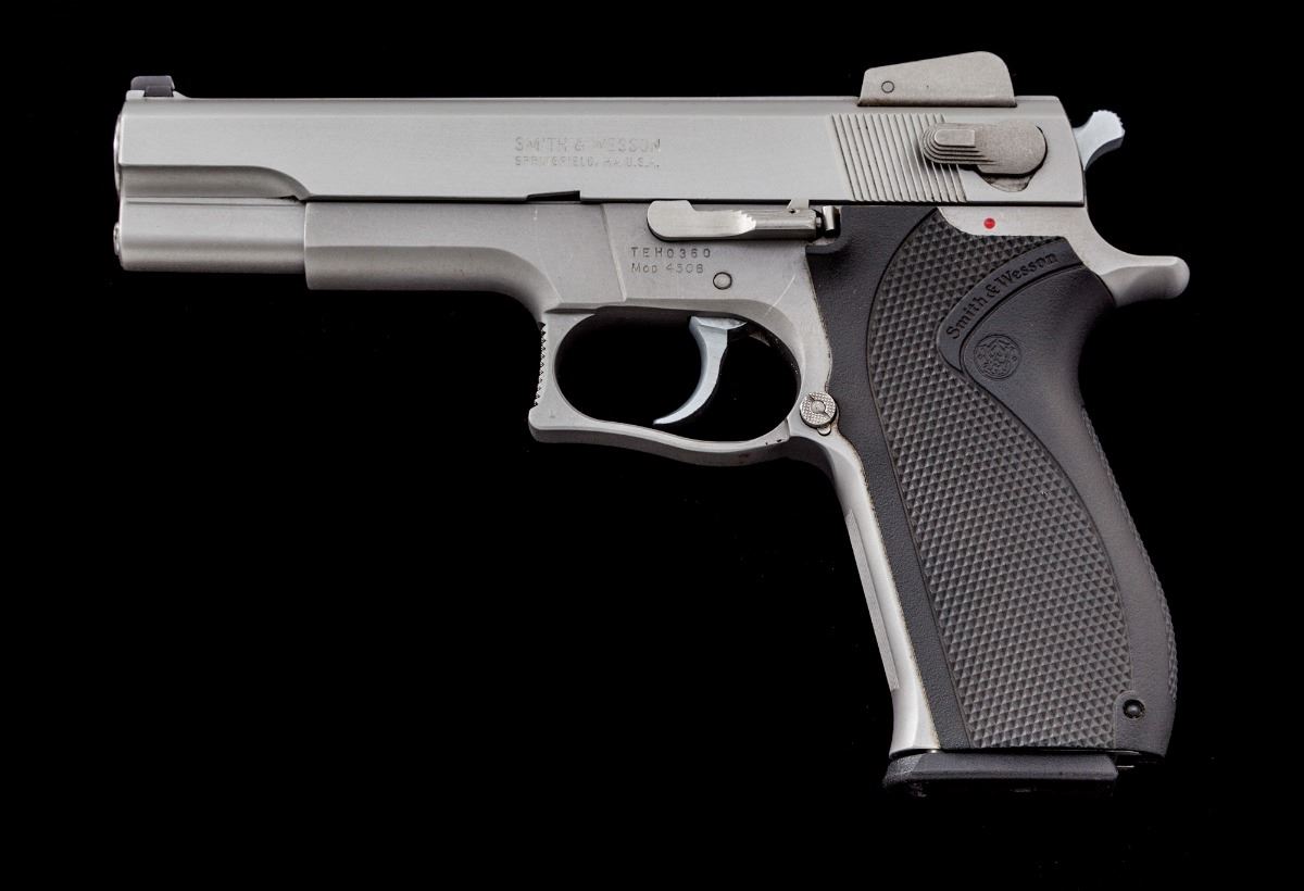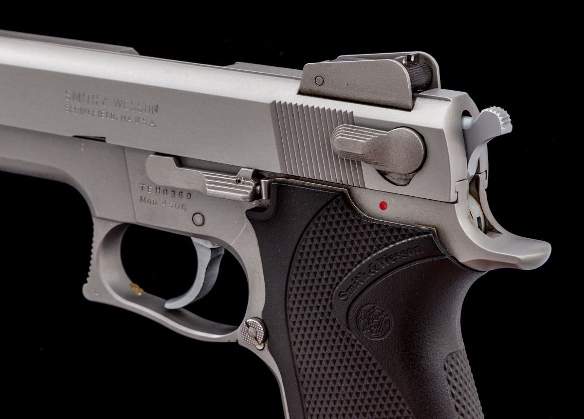 Smith & Wesson Model 4506 DA/SA Semi-Automatic Pistol, #TEH0360, .45 ACP cal., 5'' barrel, satin stainless steel, combat triggerguard, serrated front grip strap, ambidextrous safety/decocking lever, factory checkered black plastic grips, white dot front sight, adjustable two-dot rear sight, with two factory 8-round magazines.  In non-original S&W box with some paperwork, S&W packing paper and original cleaning tools.  Condition is excellent showing light marks from handling, including one faint ring from being disassembled.  Grips and action are like new, bore is excellent.  Est.:  $500-$700.  (Modern) (Not available to Calif. residents.)