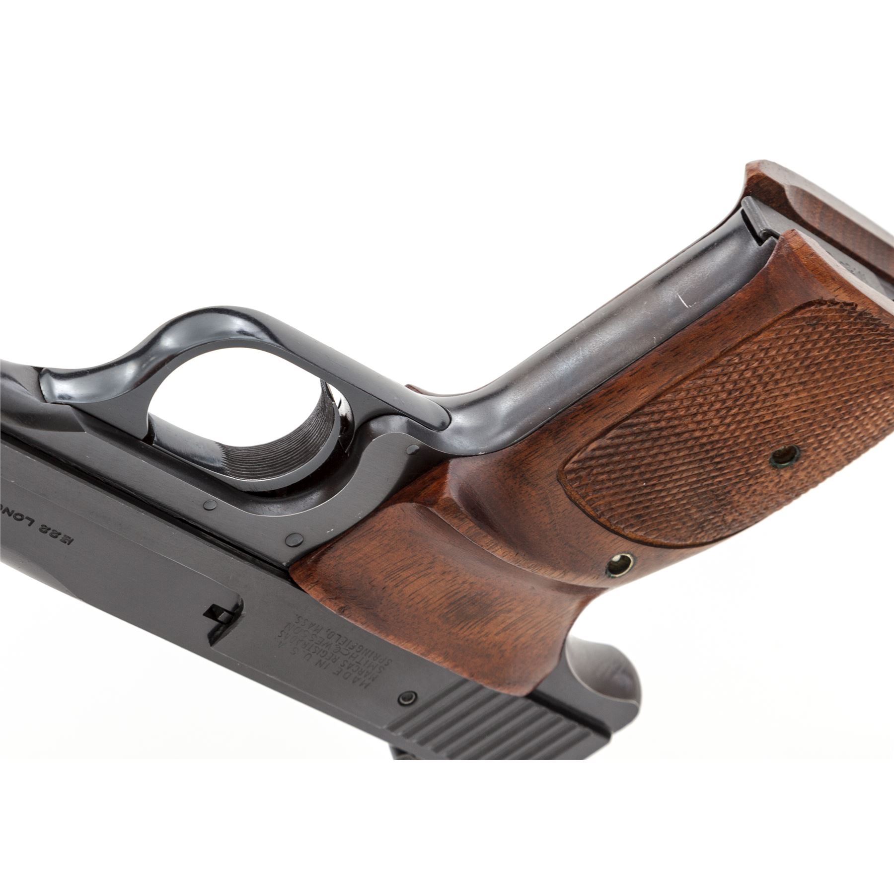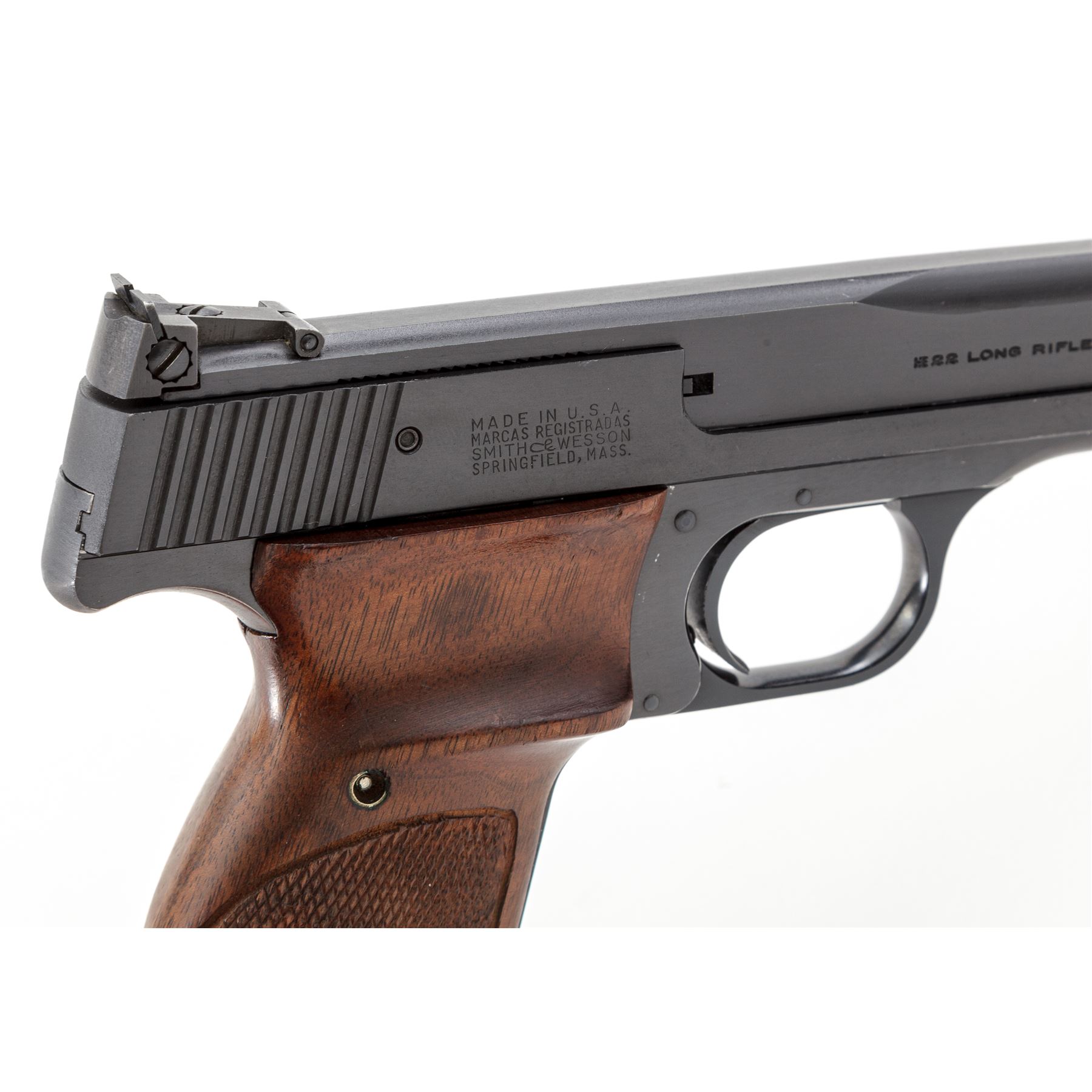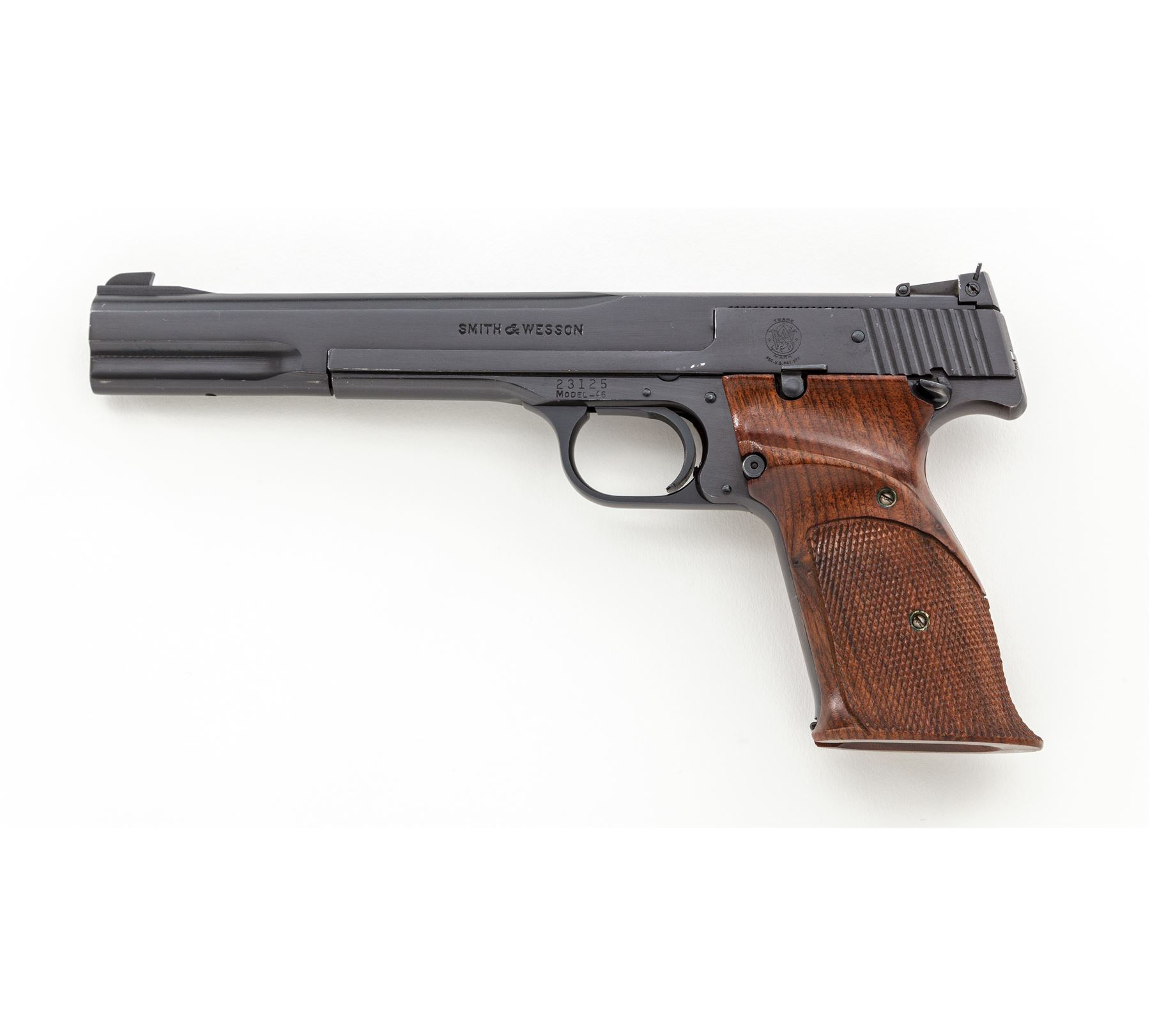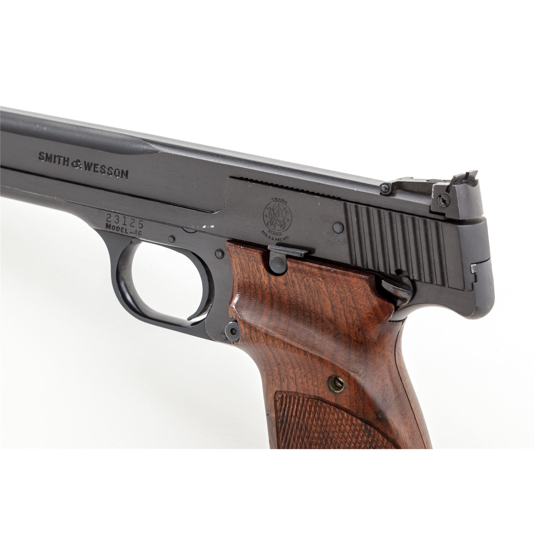 Smith & Wesson Model 46 Semi-Automatic Pistol, #23125, .22 LR cal., 7'' barrel, blue finish, checkered walnut thumb-rest grips, Patridge front sight and fully adjustable square-notched rear sight, with one magazine marked on base ''S&W''. Approx. 2,500 of the 4,000 total Model 46s produced were of the 7'' barrel variation, ca. 1957-1966. Condition is about fine retaining approx. 92% factory blue, with scattered small marks from handling and range use; thinning to the front gripstrap and mild high edgewear accounts for a majority of the finish loss. Factory lettering is clear and defined. Grip checkering is crisp and clean with intermittent handling marks to the smooth borders, all are normal for a moderately used pistol. Smooth action, bright bore with excellent rifling. Est.: $800-$1,200. (C&R/PPT)