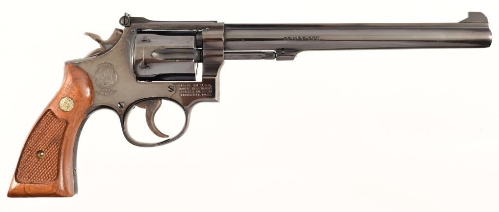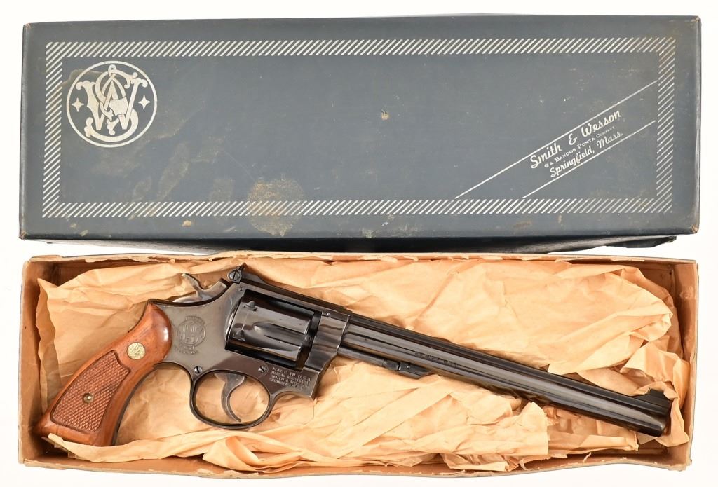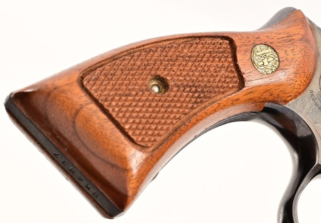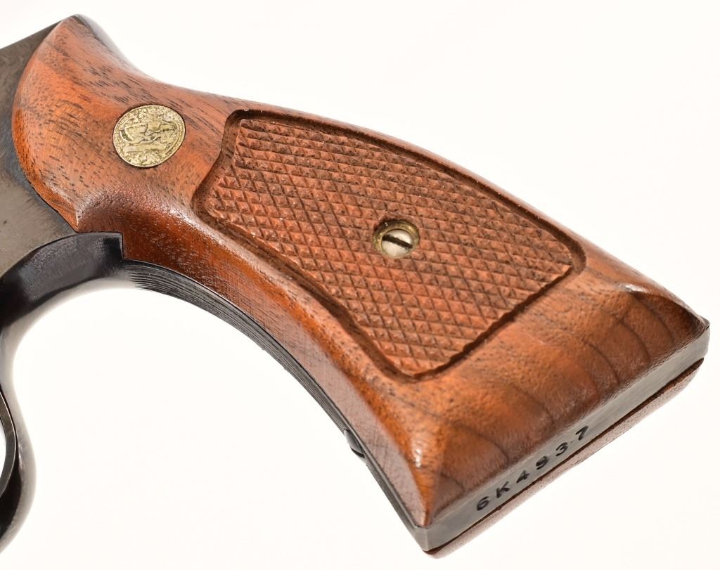8.375" pinned barrel, 4 screw frame, blue finish. Serial 6K4937 (1974), in good condition with 3 light wear marks on left side of barrel, with original blue box.