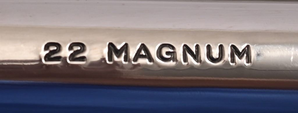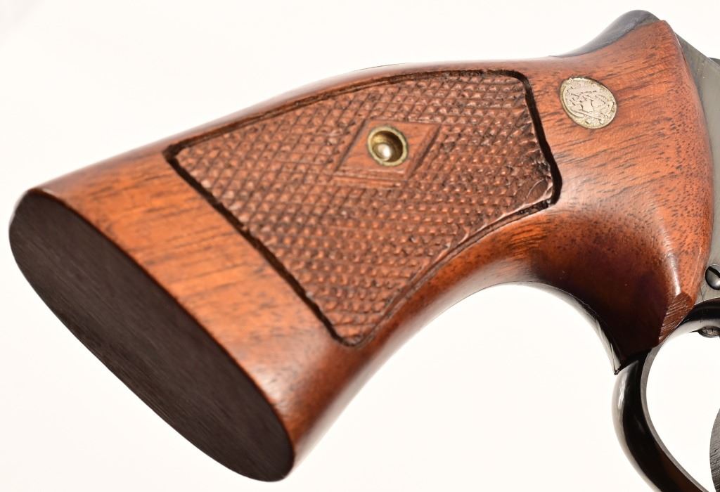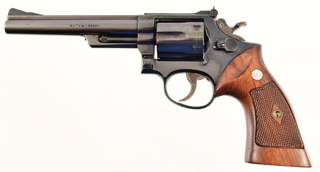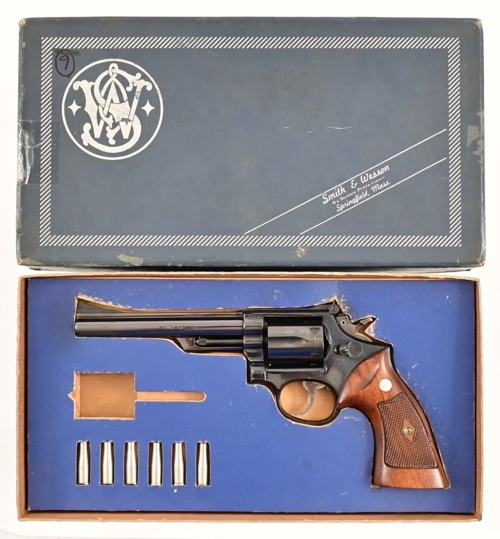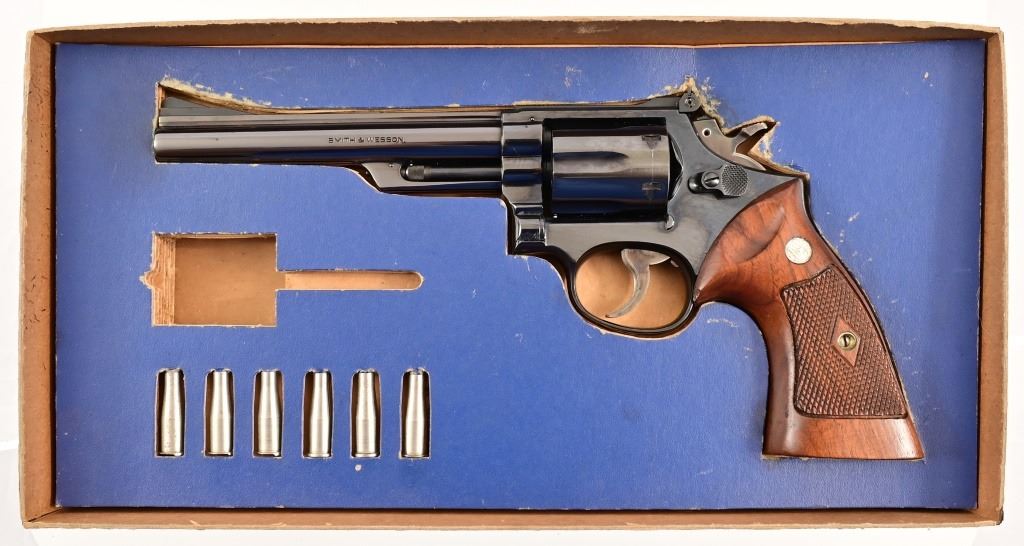 6" pinned barrel, blue finish, checkered diamond wood grips. Serial K444059 (early 1961) excellent condition, with original blue box and cylinder inserts.