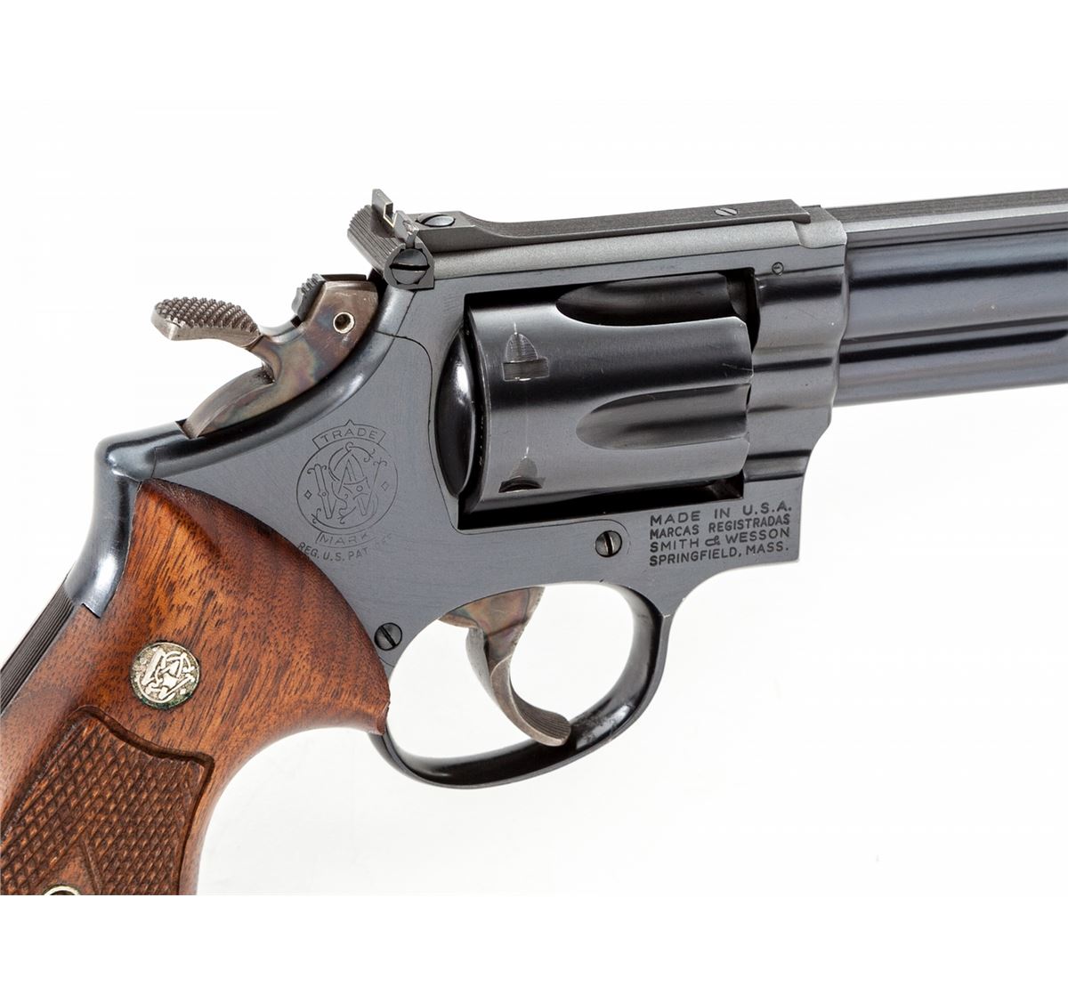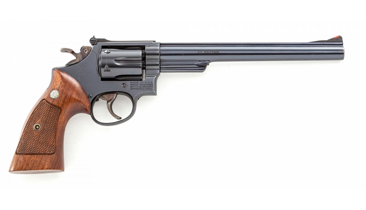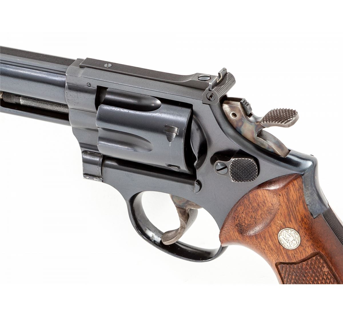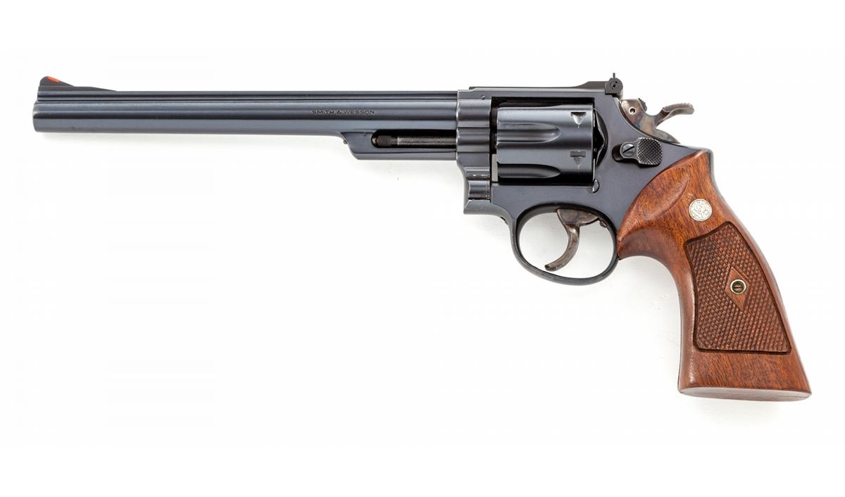 Smith & Wesson Model 53 Double Action Revolver, #K473997, .22 CF Jet/.22 mag. cal., 8-3/8'' barrel, blue finish, early style large diamond checkered walnut grips with S&W medallions. Red ramp front and white outline rear sight; target trigger and hammer, with rim and centerfire selective hammer. Mfg'd 1961-1974. Condition is excellent showing light wear at muzzle, faint index mark to cylinder. Grips show only the lightest flattening. Action is good, bore is fine. Est.: $750-$1,000. (C&R/PPT)