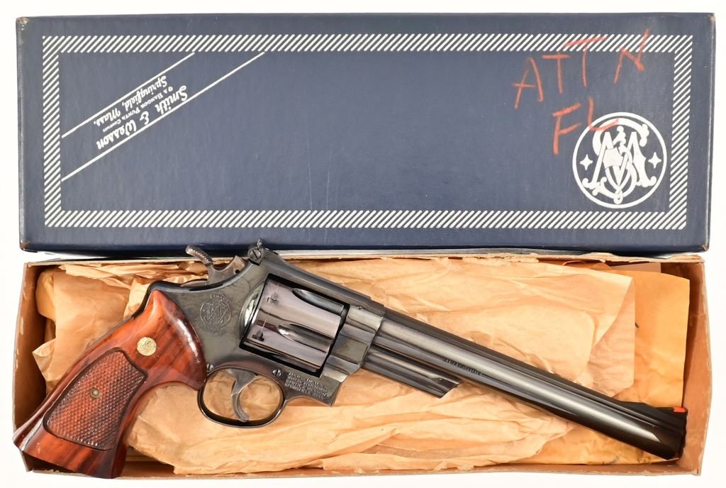 8.375" pinned barrel, 3 screw frame, blue finish. Target hammer, trigger, and sights, with correct diamond delete grips. Serial N648929 (1980) excellent condition 99% with original blue box.