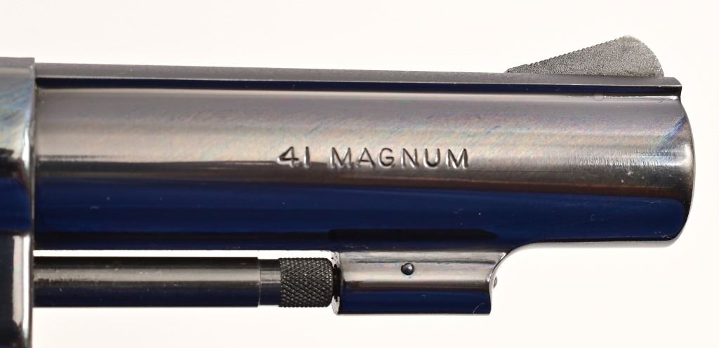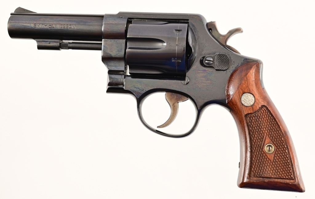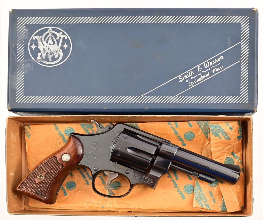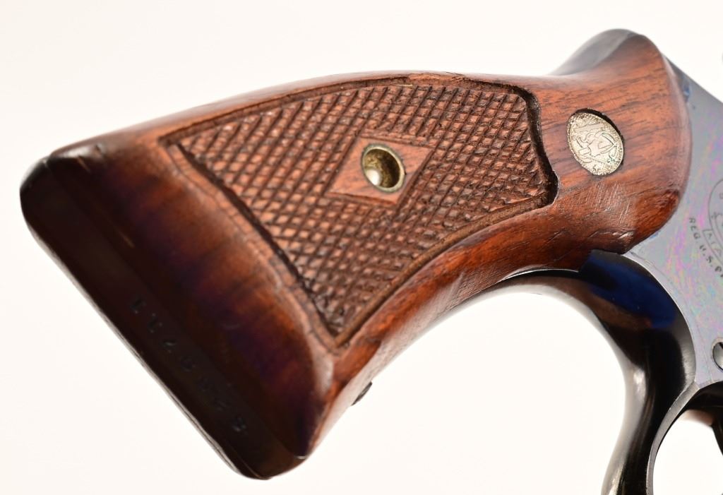 4" pinned barrel, standard trigger & hammer, checkered wood diamond grips. Serial S259711, manufactured 1964, in excellent condition with original blue box & paperwork.