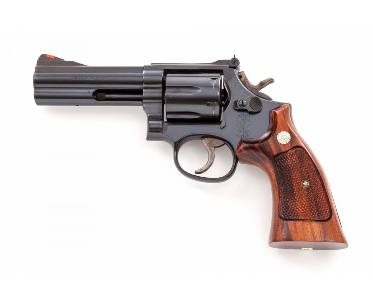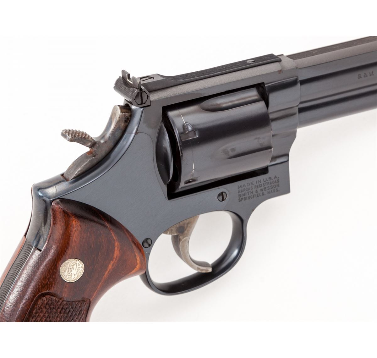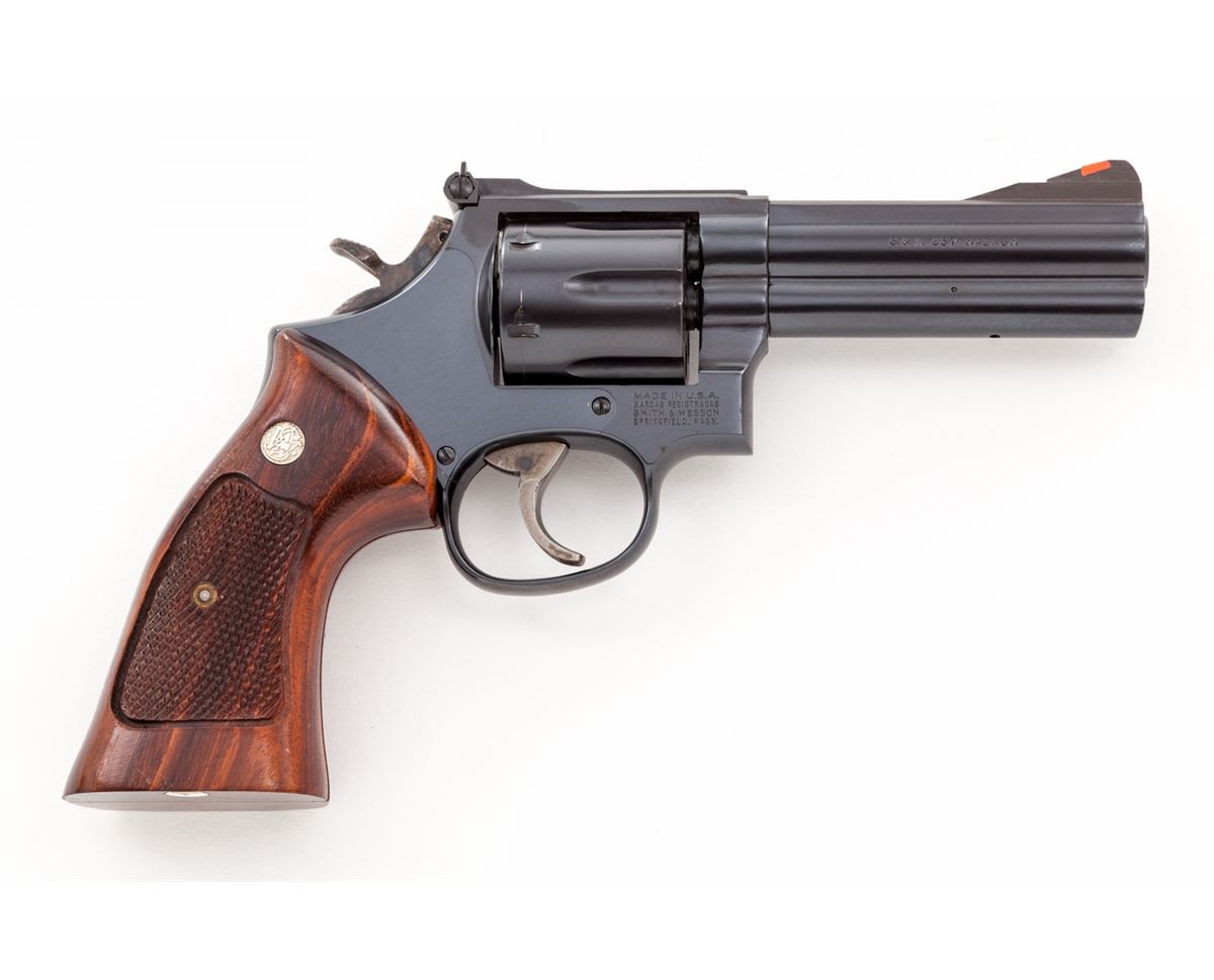 Smith & Wesson Model 586 Double Action Revolver, #AEN4611, .357 mag. cal., 4'' barrel, blue finish, factory checkered walnut grips with S&W medallions. Red ramp front sight and white outline rear sight. A nice 1st generation 586. Condition is excellent showing only light marks from handling and minor range use. Light index mark to cylinder. Grips still retain inspector's sticker at butt. Est.: $500-$750. (Modern/PPT)