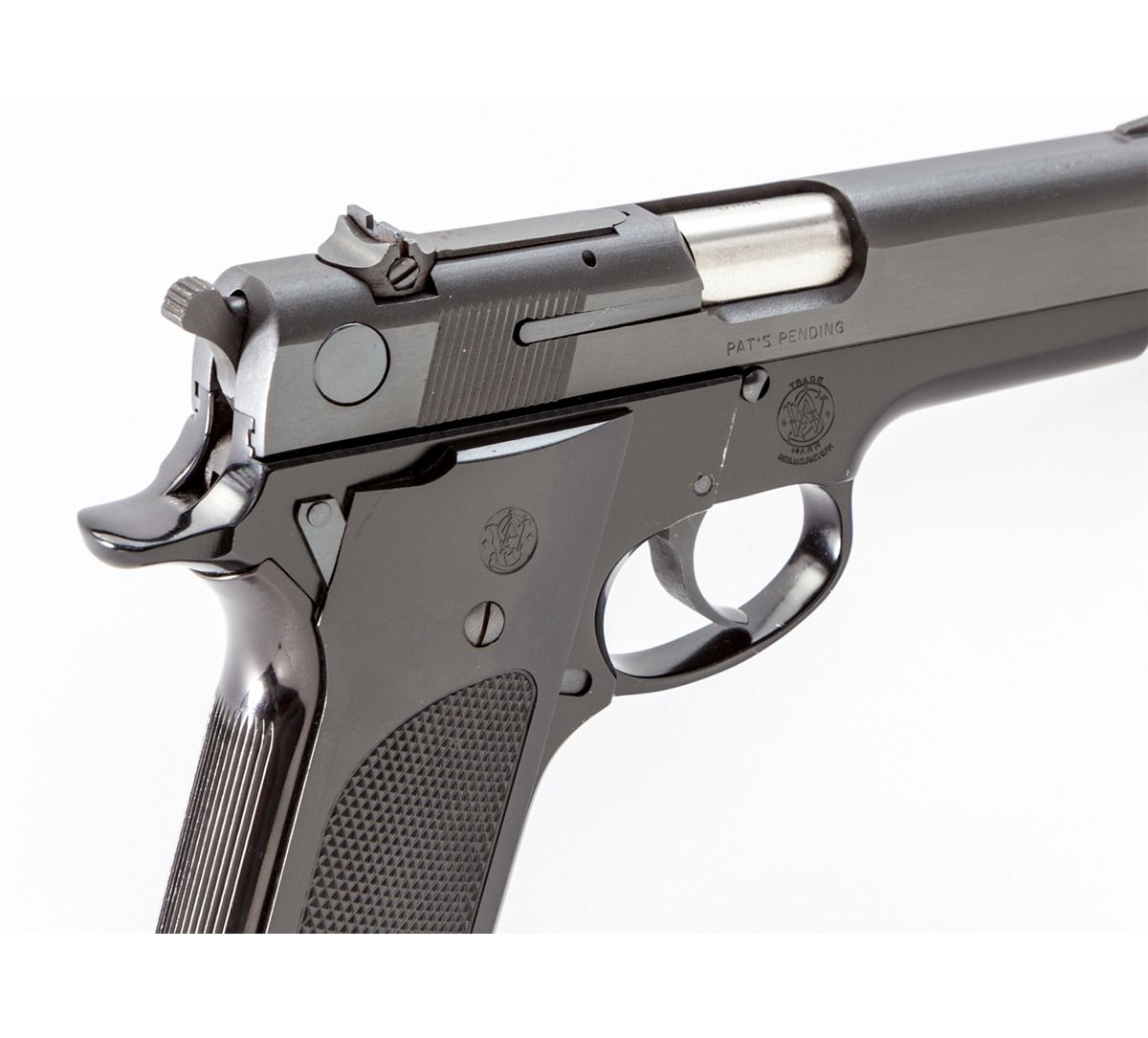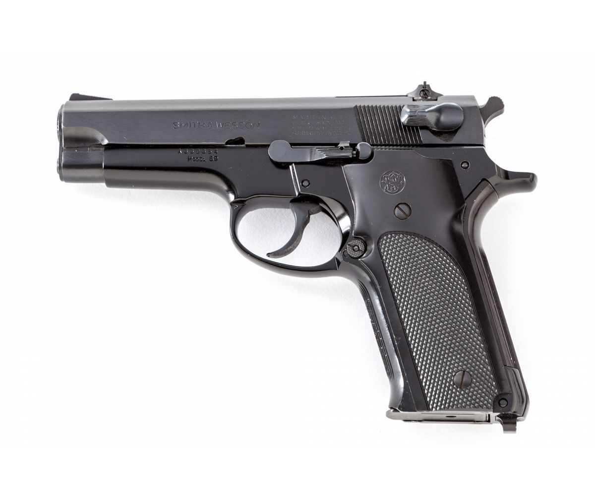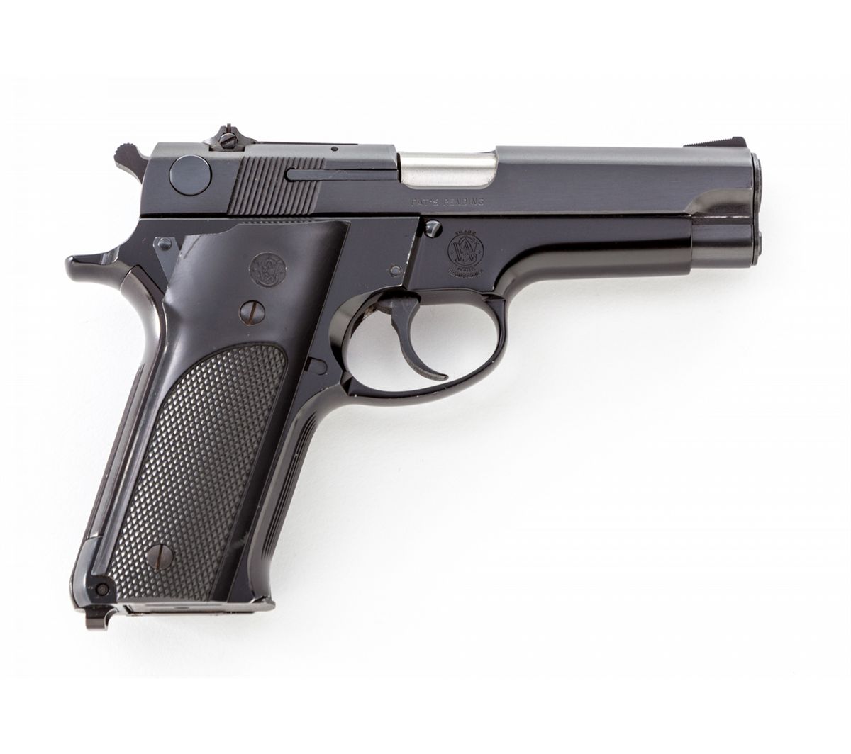 Smith & Wesson Model 59 Semi-Automatic Pistol, #A330354, 9mm, 4'' barrel, blue finish, factory checkered black plastic grips, with two factory and two aftermarket magazines. Condition is excellent showing just light marks from handling and just the slightest toning to rear sight. Action is good, bore is bright. Est.: $500-$750. (Modern) (High cap mags are not available to Calif. residents.)