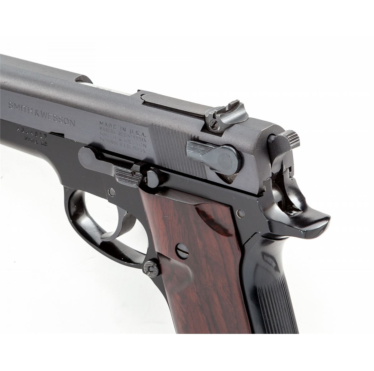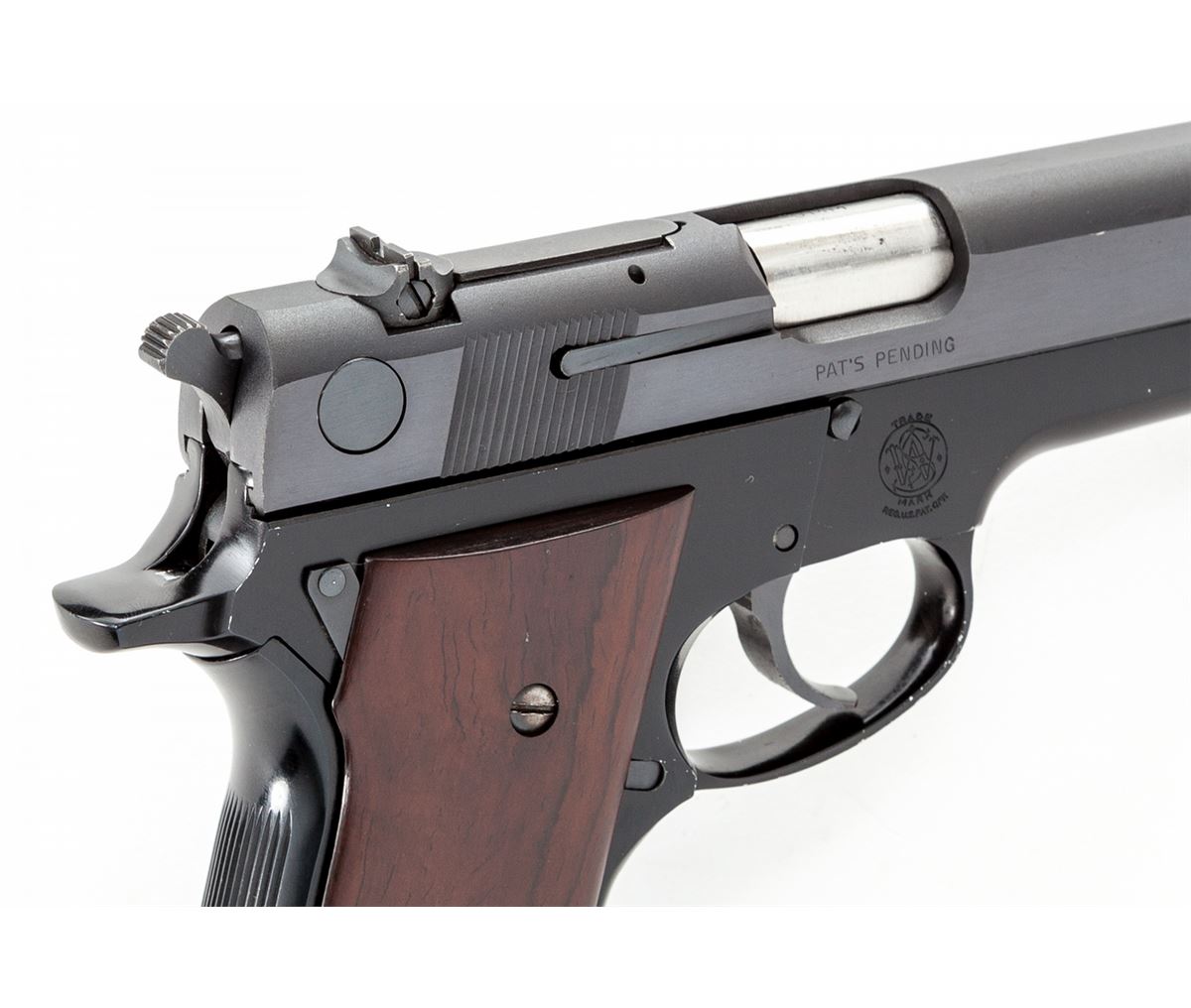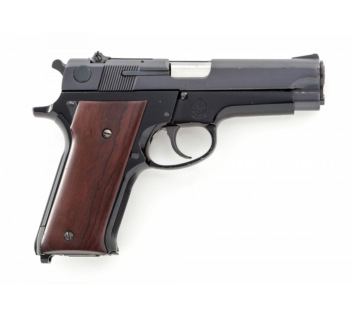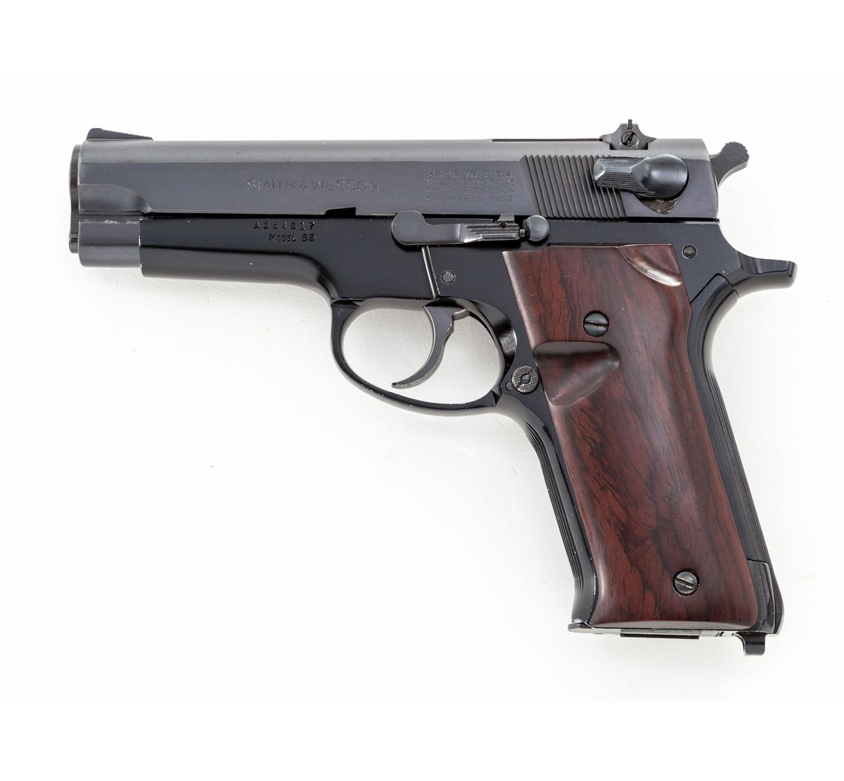 Smith & Wesson Model 59 Semi-Automatic Pistol, #A354817, 9mm, 4'' barrel, blue finish, smooth rosewood grips, with one (1) high-capacity magazine. Condition is excellent showing little use, with very light thinning to top right grip screw. Aftermarket grips fit well and show little use. Action is crisp, bore is bright. Est.: $450-$600. (Modern/PPT) (High-cap mags not available to Calif. residents.)