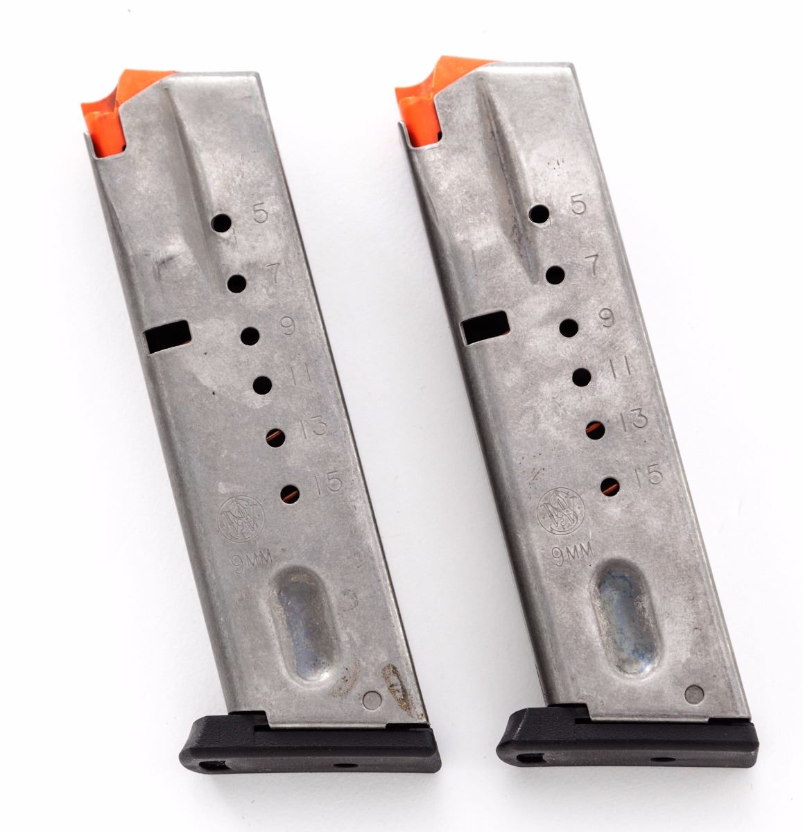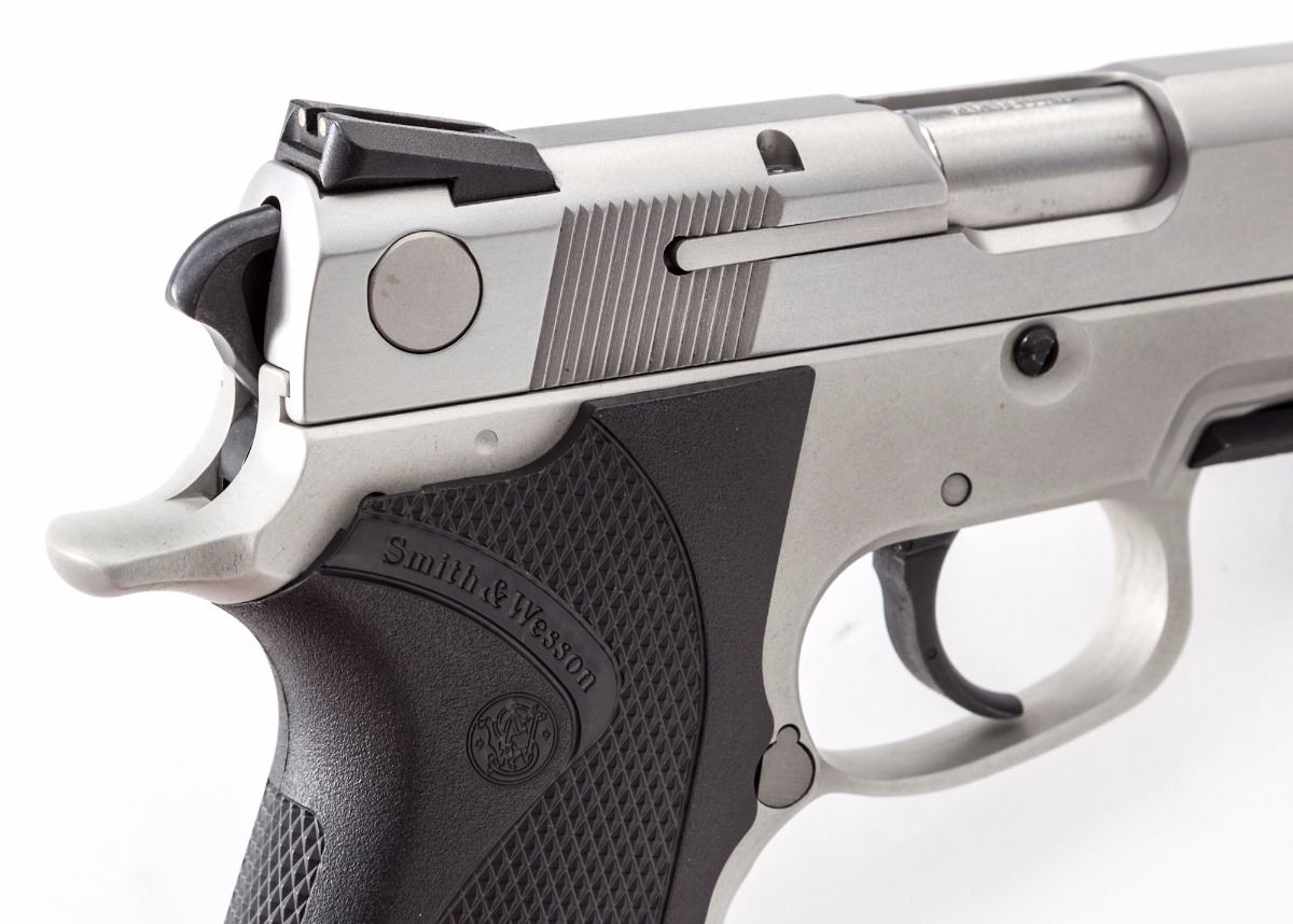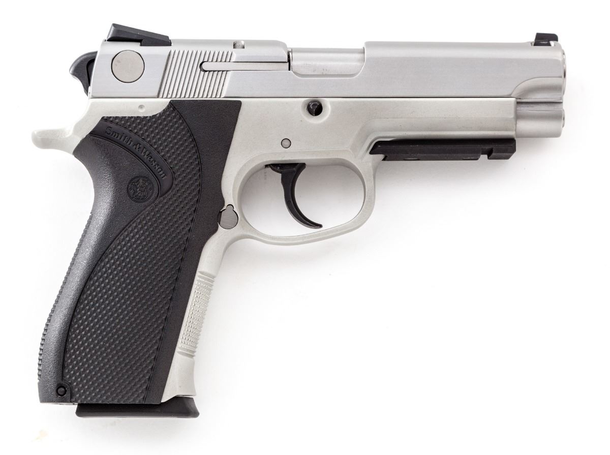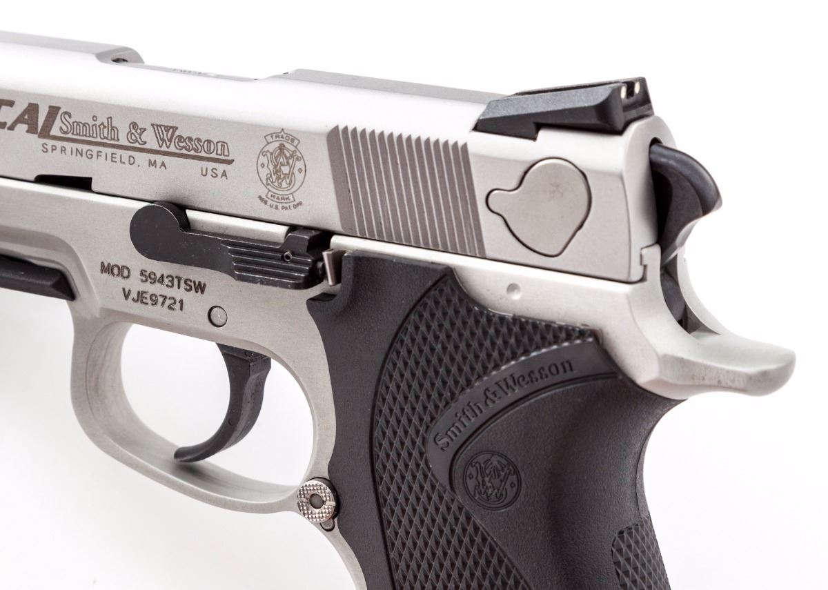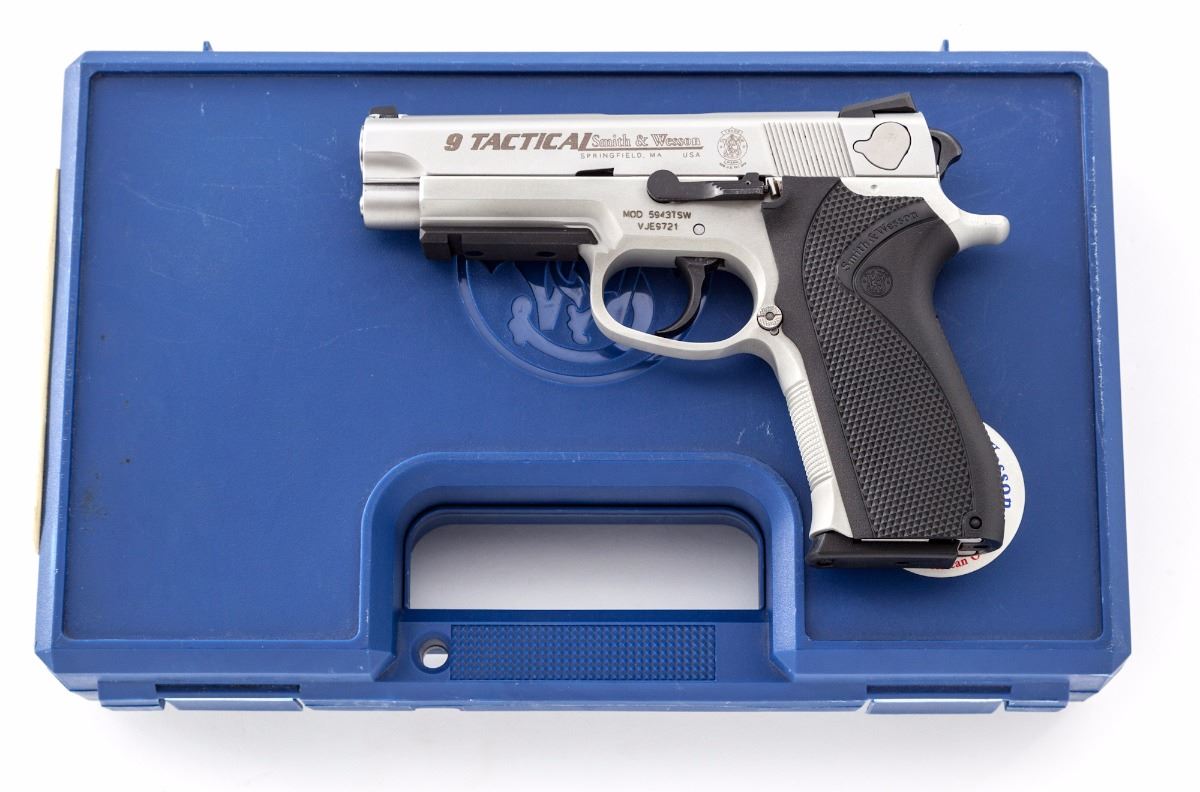 Smith & Wesson Model 5943 TSW Semi-Automatic Pistol, Double Action Only, #VJE9721, 9mm, 4'' barrel, stainless slide, aluminum alloy frame, checkered front grip strap, factory checkered black plastic S&W grips, lower rail, bobbed hammer, white three-dot sights, with three (3) high-capacity 14-round S&W magazines, in blue S&W hard case with matching end label, gun lock, owner's manual, other misc. paperwork, and S&W packing paper. Condition is excellent, appearing as new, with a few light scuffs from handling. Grips are near mint. Pistol shows only signs of light use. Est.: $500-$750. (Modern) (Not available to Calif. residents.)