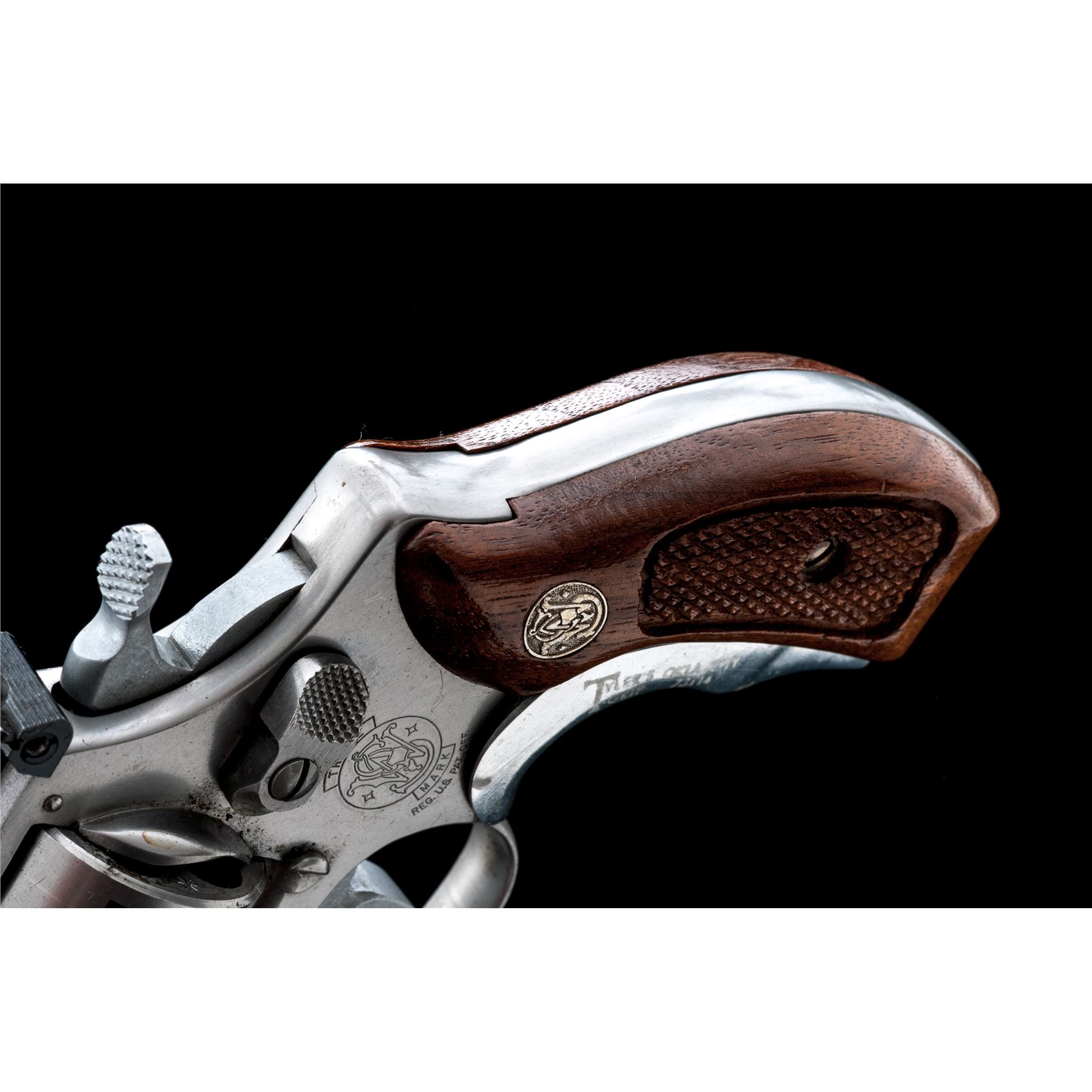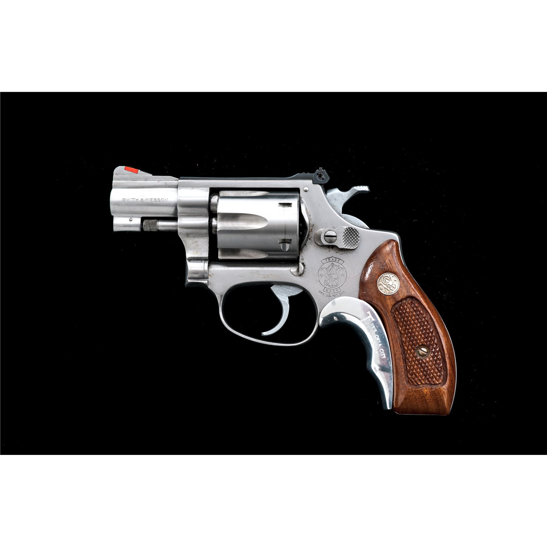 Smith & Wesson Model 63 Double Action Revolver, #BFV9719, .22 LR cal., 2'' barrel, stainless steel, checkered hardwood grips with S&W logos; red ramp and standard adjustable rear sight. Added aluminum grip adapter. Post-1981 production. Condition is excellent overall with very light discoloration from holster use. Grips and action are crisp, bore is bright. Est.: $450-$650. (Modern/PPT)