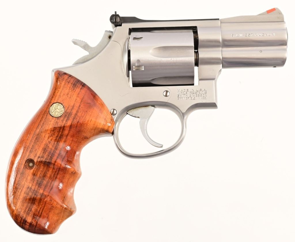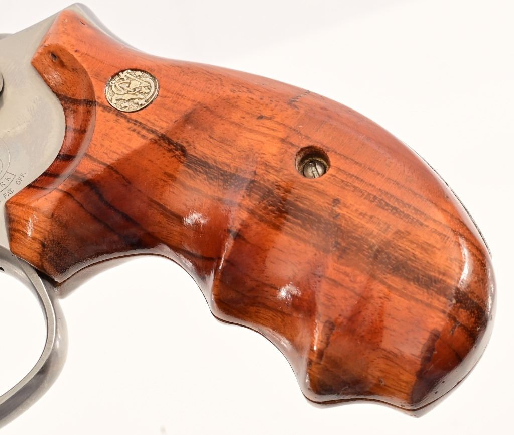 2.5" barrel, stainless finish, checkered Goncalo Alves (Tigerwood) grips with finger grooves. Standard trigger, and hammer, with ramped target sights. S/N ANS9571
