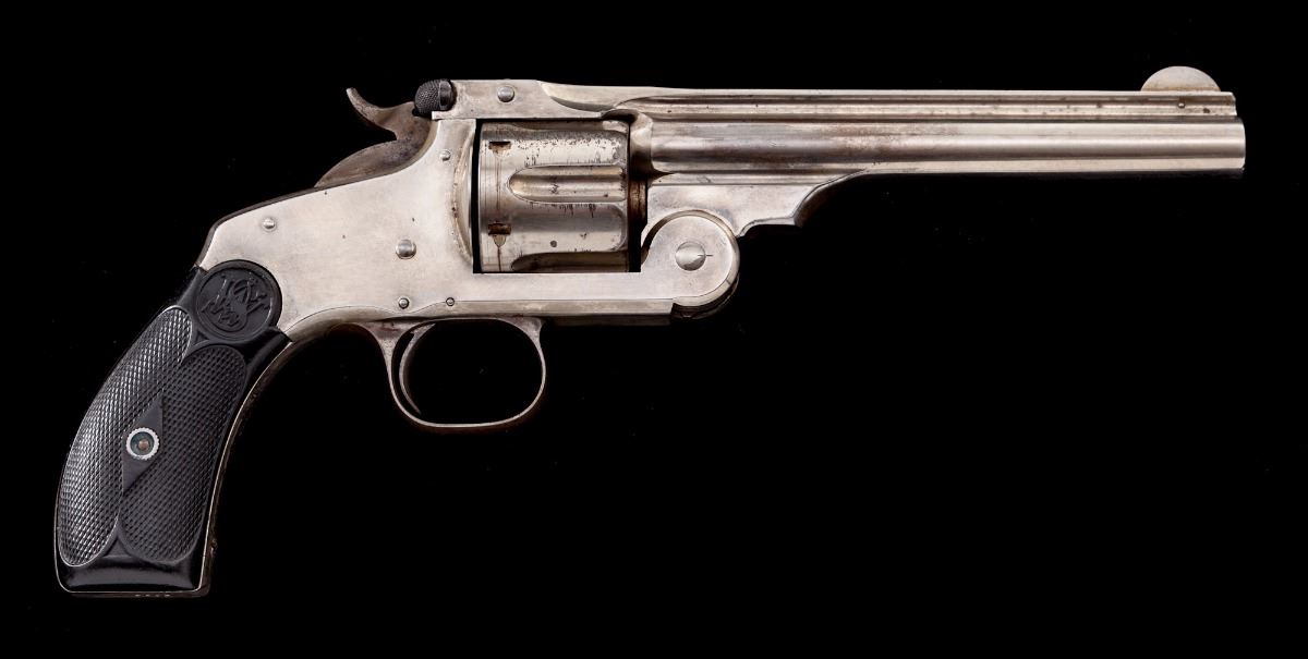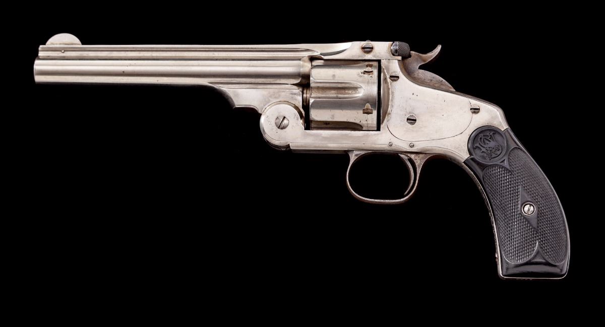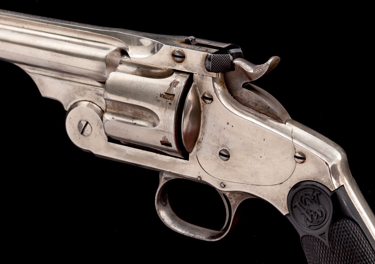 Smith & Wesson New Model No. 3 Single Action Revolver, #3501, .44 Russ. cal., 6'' barrel, nickel finish, checkered hard rubber grips. Condition is excellent retaining approx. 90%-92% original nickel, with most of the losses to cylinder and triggerguard. Face of cylinder, butt of frame, and inside edge of barrel extension with matching serial numbers. Grips are excellent with no cracks or losses. Action is tight with excellent lock up and timing. Bore is bright with a couple areas of corrosion near the breech which should clean. Est.: $3,000-$4,000. (Antique)