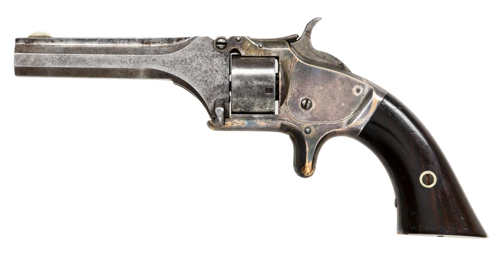 Cal. .22 RF. S#101185. Bbl 3 1/4". Silver finish w/ 2 piece smooth wood grips. Frame appears to have been polished at one time. Half-moon front sight w/ notched rear sight. Matching serial number on frame and grips (stamped on interior of right grip panel). Matching assembly number "7P" present on frame, cylinder, and bbl. Bbl pin is not present. CONDITION: Frame retains good amounts of its silver finish, exhibiting darkening and areas of wear overall that show through to the brass frame. Dark bore. Grips exhibit scattered marks from handling and storage, w/ a minor loss to the bottom left corner on the left grip panel. (01-23591/MLW). ANTIQUE. $300-500.