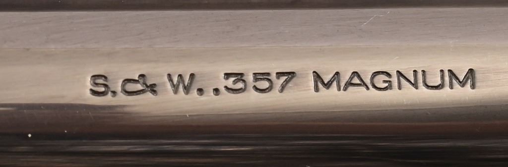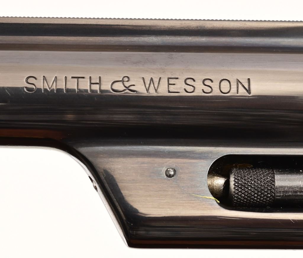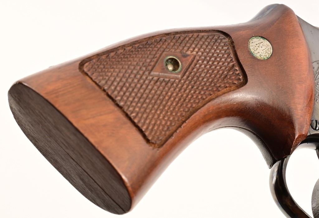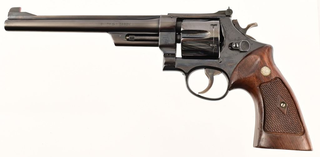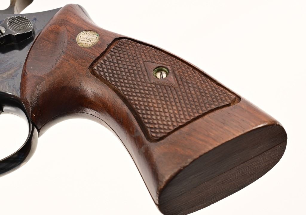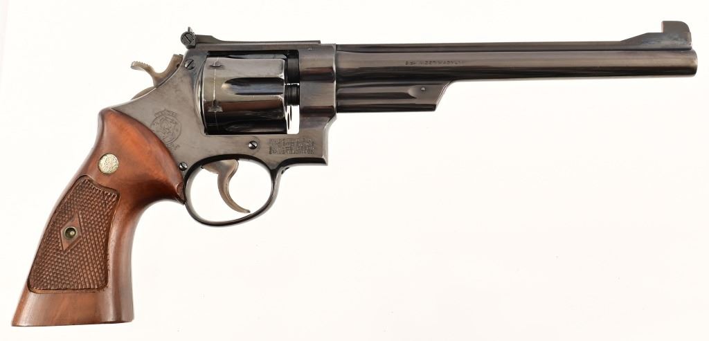 Square-butt "N" target 4 screw frame, with 6 groove forestrap & backstrap. 8.375" pinned barrel, blue finish, checkered wood diamond grips. Serial S162705, in near excellent condition.