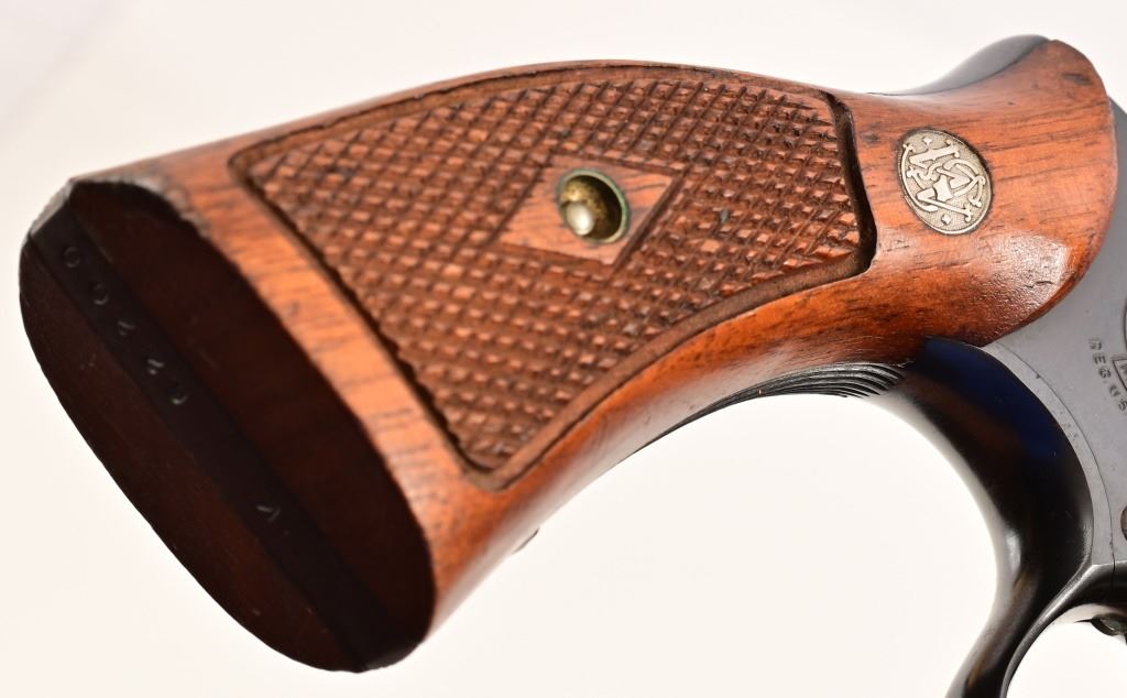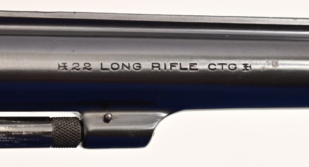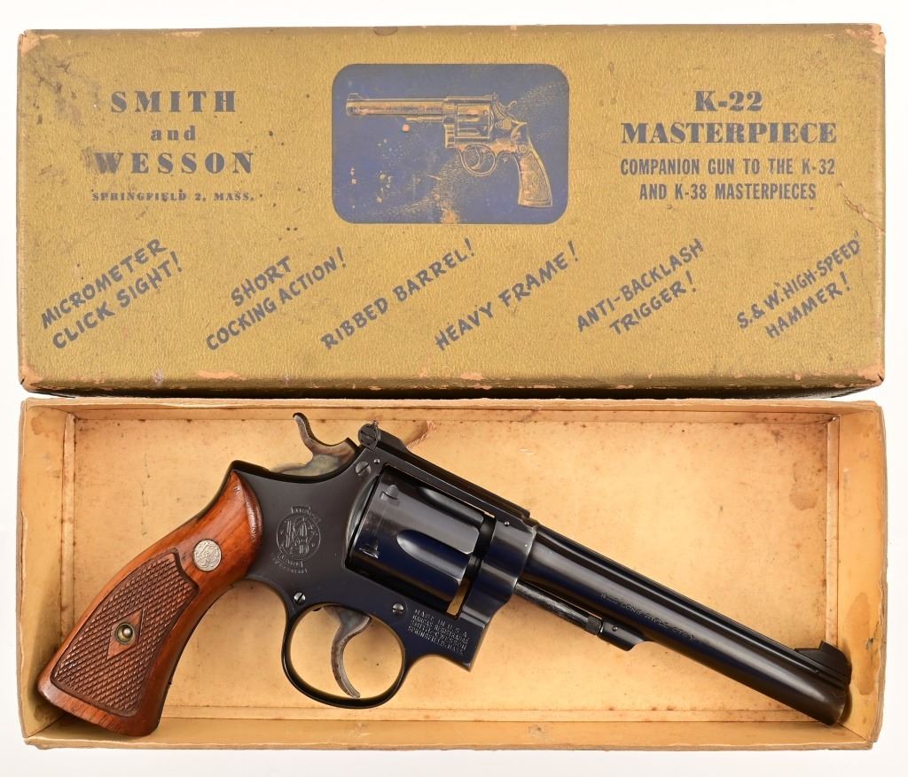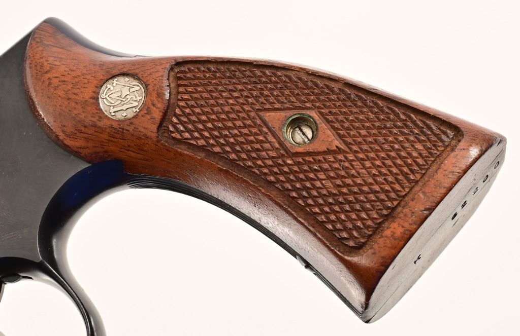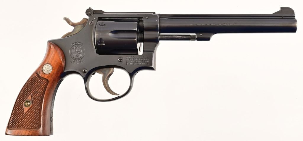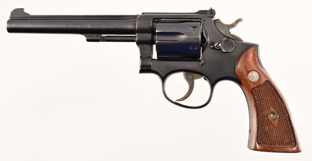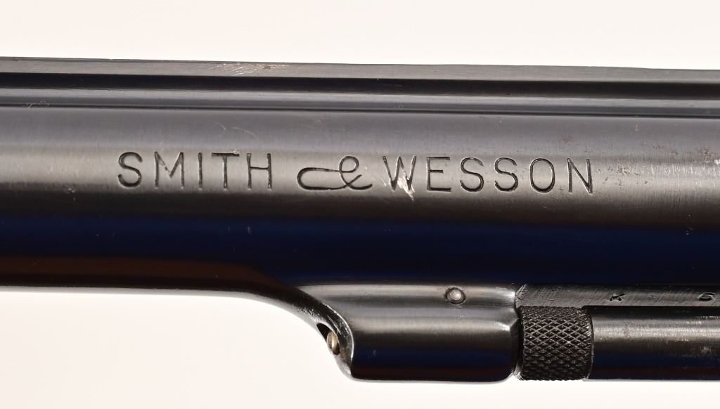 Post-war 3rd model, 5 screw side plate. 6" pinned barrel, blue finish, checkered diamond delete grips. 1/10" Patridge front sight, Micrometer rear sight, 6-groove front and rear straps. Serial K62200, manufactured 1948. Very good condition, with correct original gold S&W box.