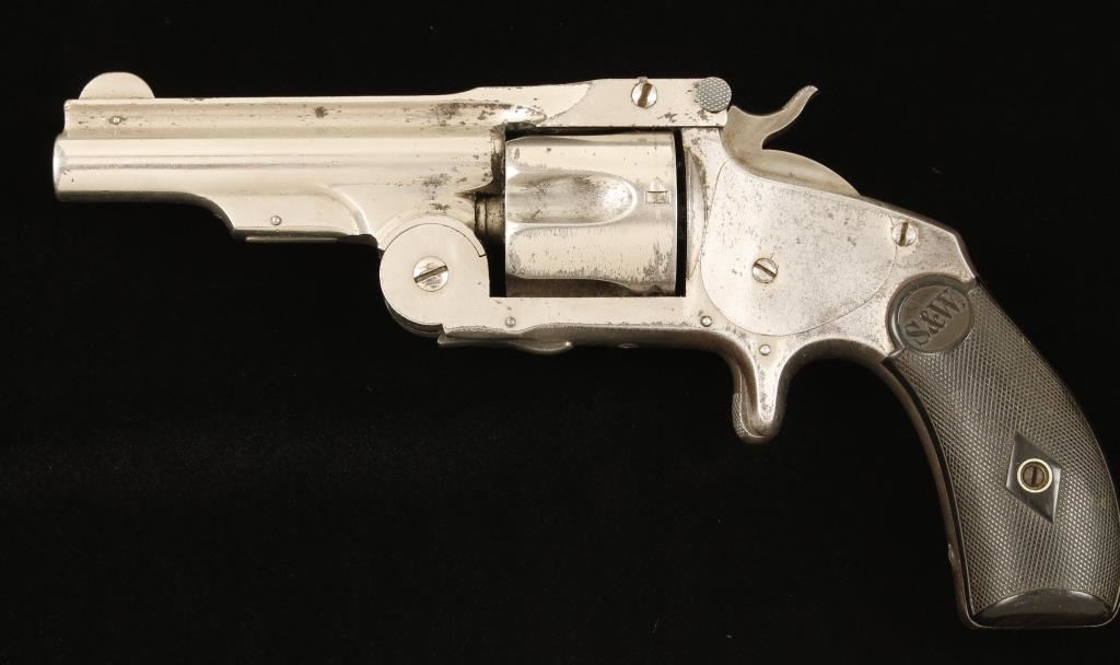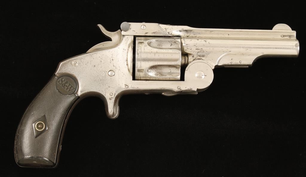 "Baby Russian". Nickeled single-action spur-triggered 5-shot top-break revolver with a 3-1/4" barrel with top rib. Plating is gone from much of the exposed contact surfaces. What remains (50% +) is scratched and dull. There is a drag line. Exposed steel has pin-prick pitting and small areas of surface rust. Blued pieces are worn/faded to grey. Bore has strong rifling and roughness from past corrosion. Chambers are shiny with light pitting. hard rubber grips are worn but complete without chips or cracks. Action works very well with good lock-up. Condition is good. *Antique Firearm*