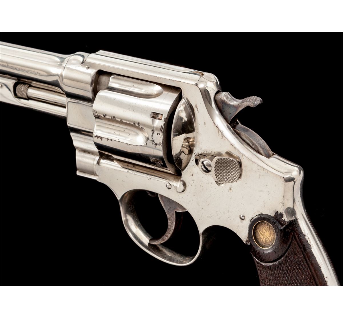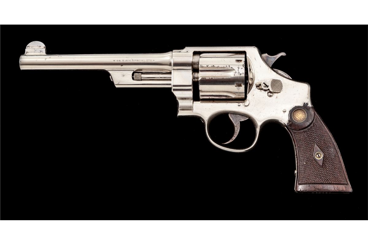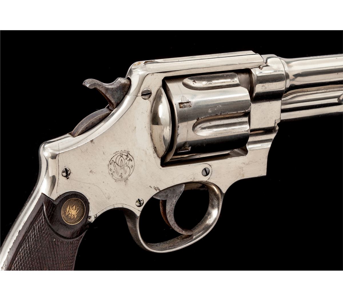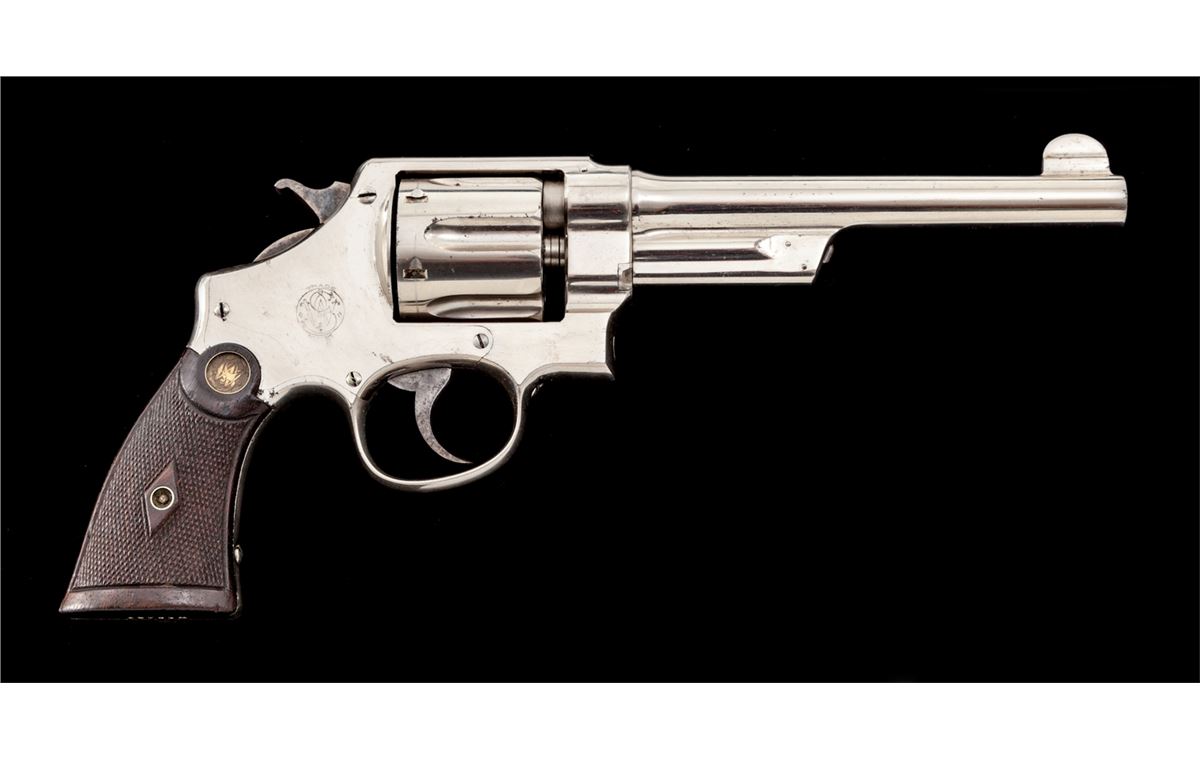 Smith & Wesson 1st Model Hand Ejector Triplelock Double Action Revolver, #13721, .44 Spec. cal., 6-1/2'' barrel, nickel finish, factory checkered diamond walnut grips, with S&W medallions. This revolver was shipped to A. Baldwin Co., New Orleans, LA, March 10, 1917, with factory letter. Condition is fine as factory renickeled in August 1941, retaining approx. 95% nickel with some corrosion and flaking just near the grip medallion on left side. Cylinder shows some minor just beginning blistering. Grips with minor flattening and oil darkening. Action is good, bore is bright. Est.: $1,500-$2,000. (C&R)