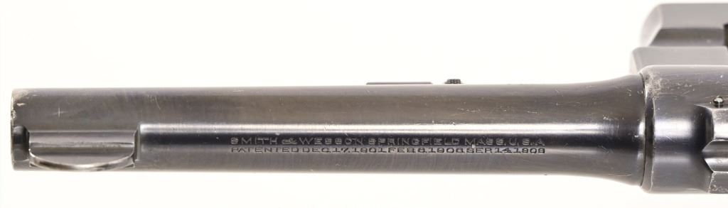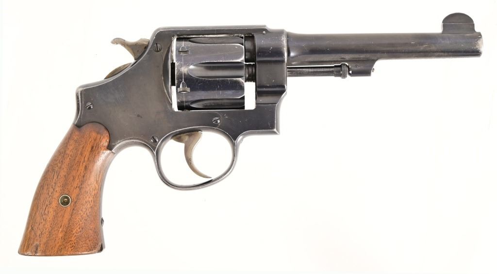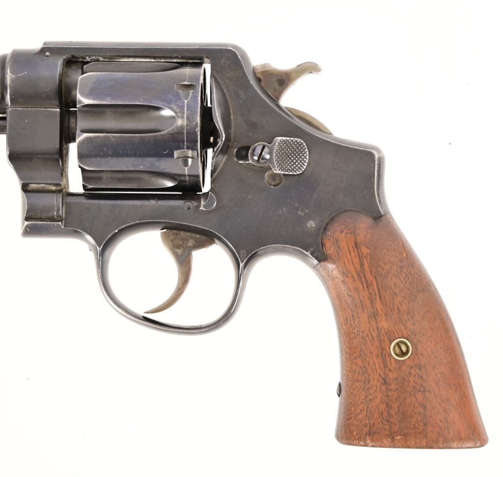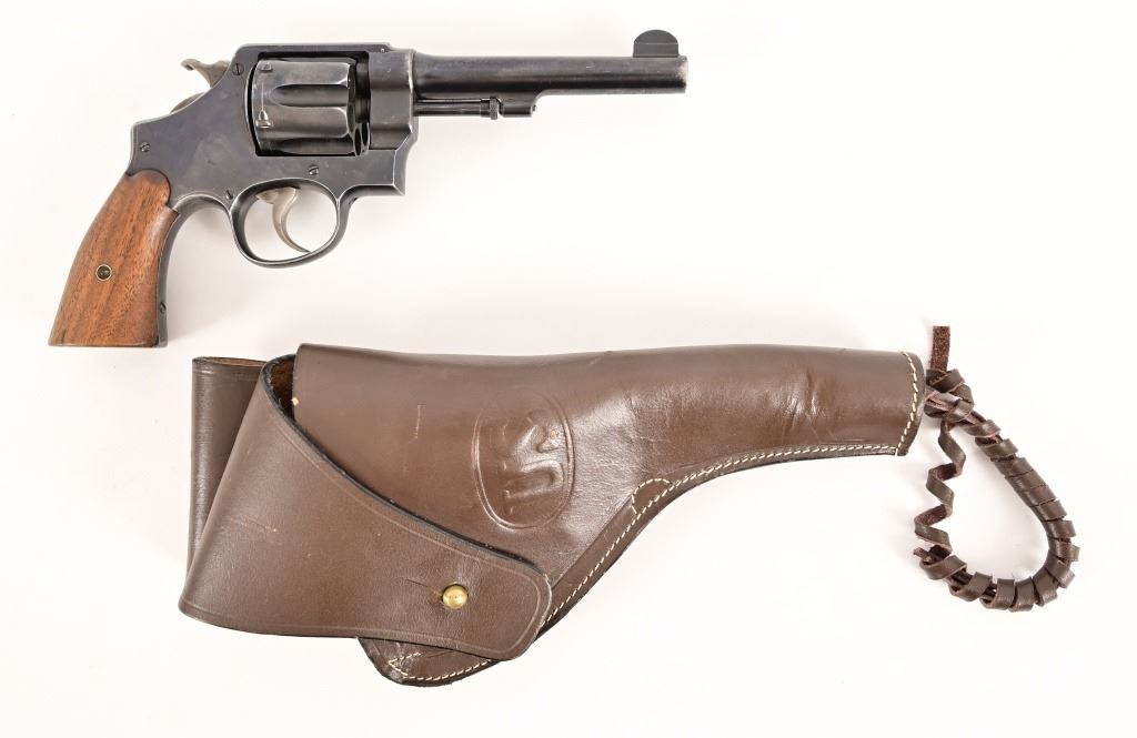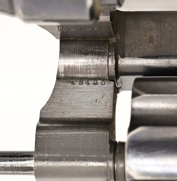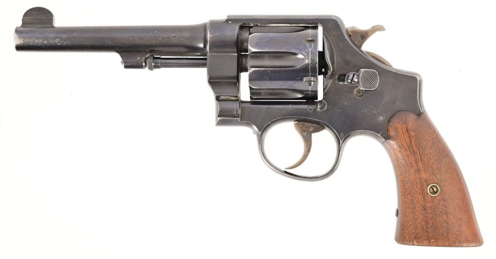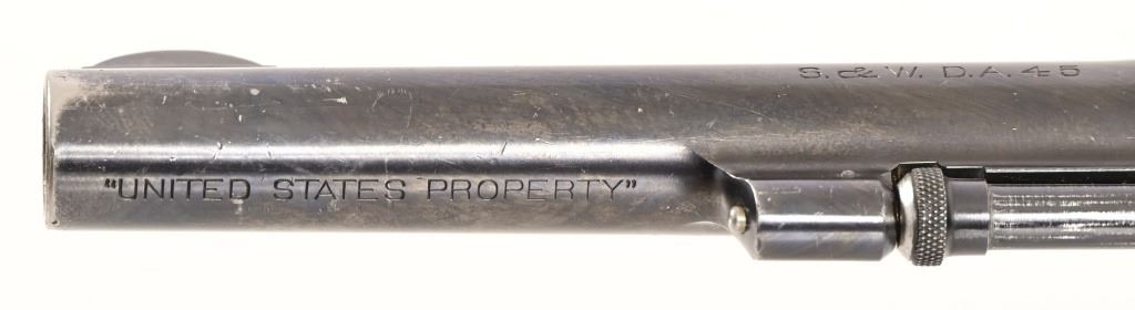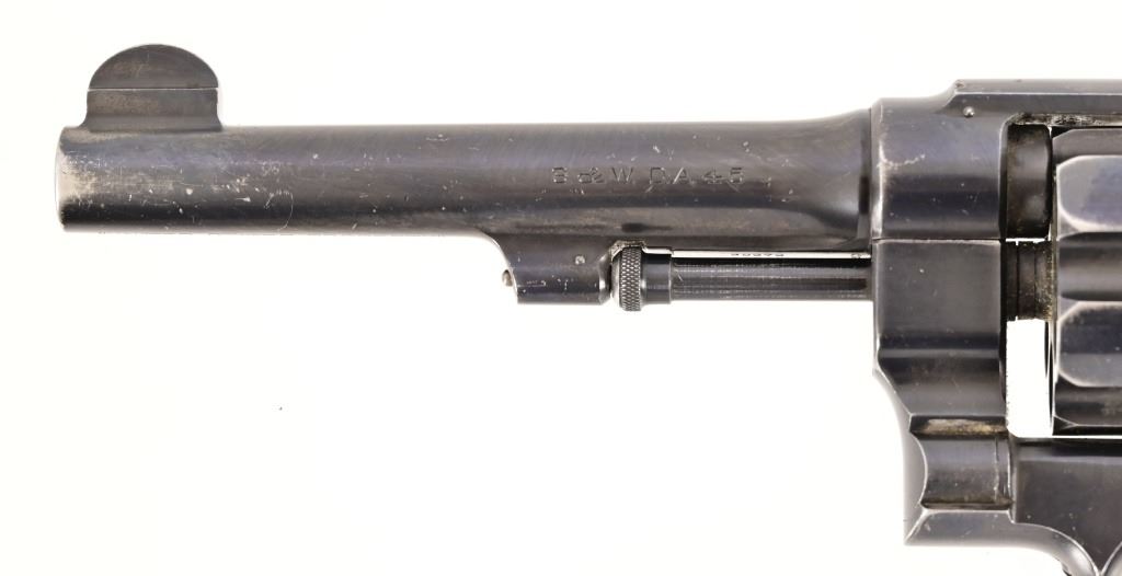 S/N 80678..45 ACP caliber. 5.5" barrel, bore is worn. Action is tight. High degree of finish remains. Grips are good. Missing lanyard ring. Contemporary flap holster. Modern.