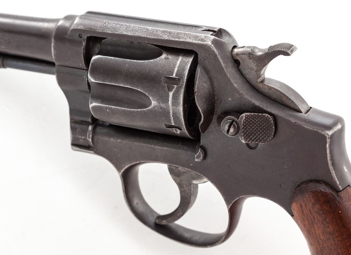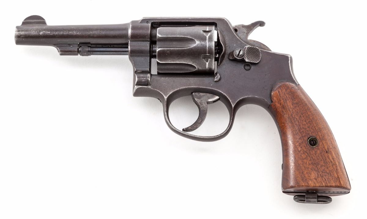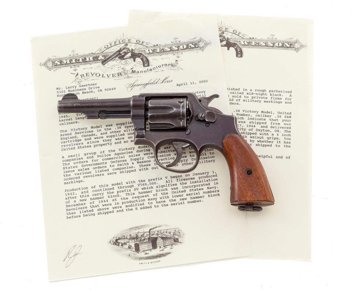 Smith & Wesson Victory Model Double Action Revolver, #V471414, .38 Spec. cal., 4'' barrel, parkerized finish, smooth walnut grips, topstrap marked ''U.S. Property G.H.D.'', with fixed combat sights. Bottom strap marked with flaming bomb. Right side of frame under the ''Made in USA'' mark has a section where an unknown mark has been obliterated. The accompanying Jinks letter shows that one pistol with this serial number was shipped 12/15/43 to the U.S. Navy, and another with the same serial number was shipped 1/17/44 to the city of Dayton, Ohio. The letter indicates that pistols shipped to non-government entities would not be U.S. Property marked and that the Requestor could determine if his was shipped to the Navy by U.S. Property marks. The presumption is that this particular revolver was a U.S. Navy delivered pistol. Condition is very good retaining approx. 80% parkerized finish turning to patina overall, including hammer and trigger. Grips are excellent with most of the original finish remaining, showing no cracks or losses. Action is tight with good lockup and timing, bore is bright. Est.: $500-$750. (C&R/PPT)