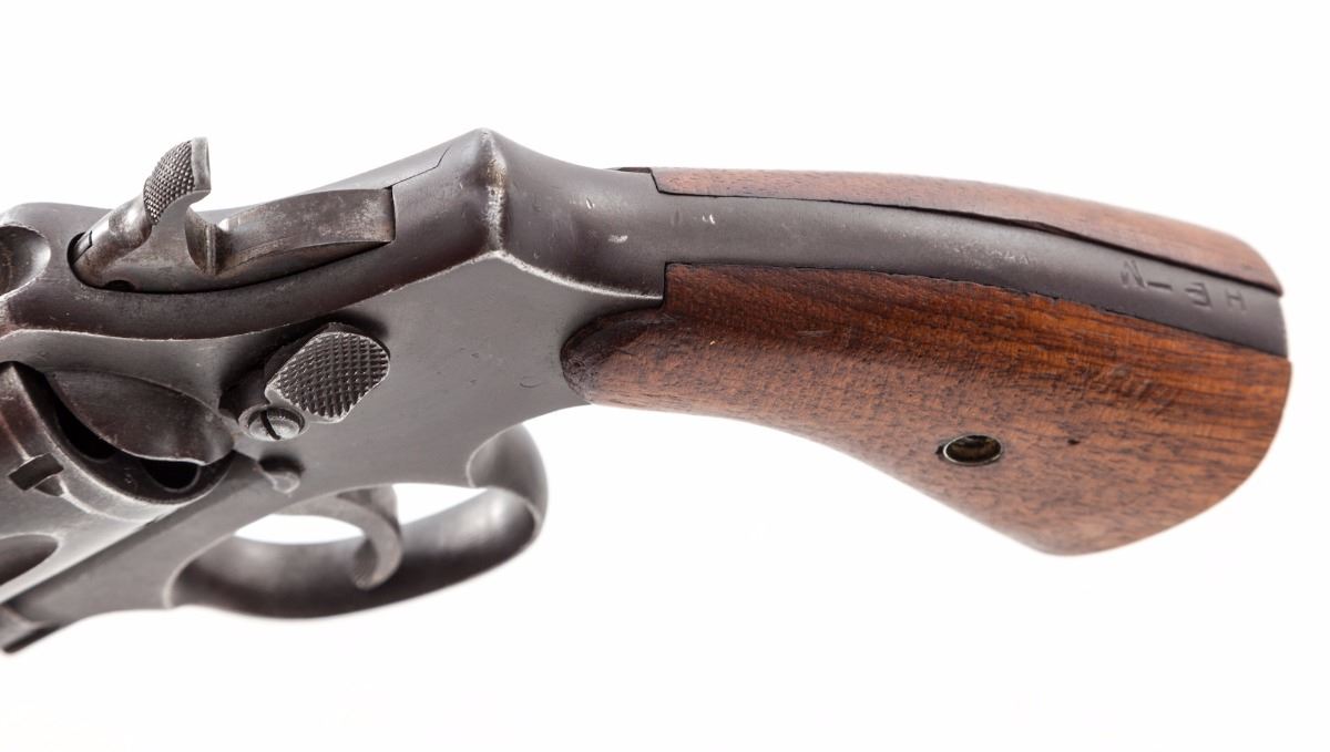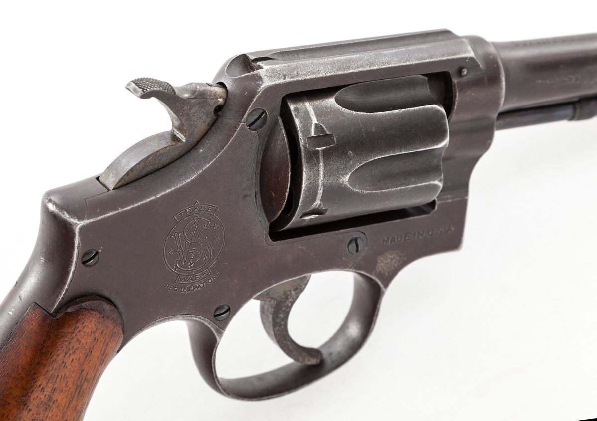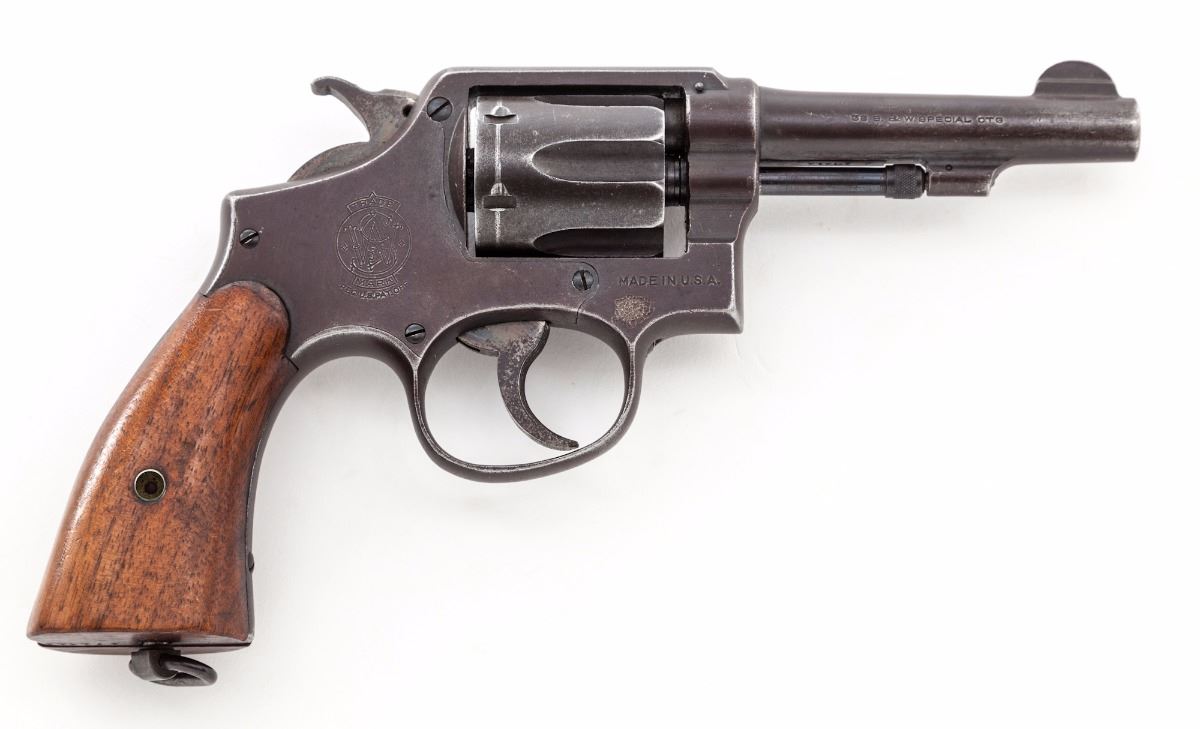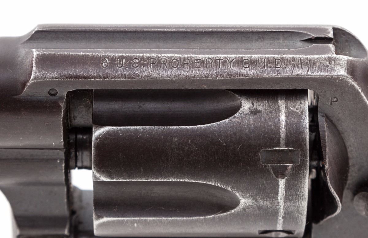 Smith & Wesson Victory Model Double Action Revolver, #V471414, .38 Spec. cal., 4'' barrel, parkerized finish, smooth walnut grips, topstrap marked ''U.S. Property G.H.D.'', with fixed combat sights. Bottom strap marked with flaming bomb. Right side of frame under the ''Made in USA'' mark has a section where an unknown mark has been obliterated. The accompanying Jinks letter shows that one pistol with this serial number was shipped 12/15/43 to the U.S. Navy, and another with the same serial number was shipped 1/17/44 to the city of Dayton, Ohio. The letter indicates that pistols shipped to non-government entities would not be U.S. Property marked and that the Requestor could determine if his was shipped to the Navy by U.S. Property marks. The presumption is that this particular revolver was a U.S. Navy delivered pistol. Condition is very good retaining approx. 80% parkerized finish turning to patina overall, including hammer and trigger. Grips are excellent with most of the original finish remaining, showing no cracks or losses. Action is tight with good lockup and timing, bore is bright. Est.: $500-$750. (C&R/PPT)
