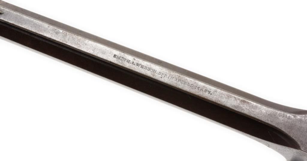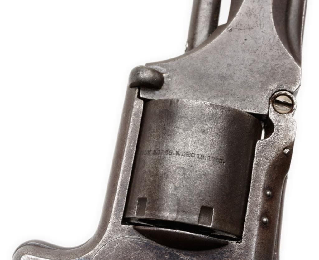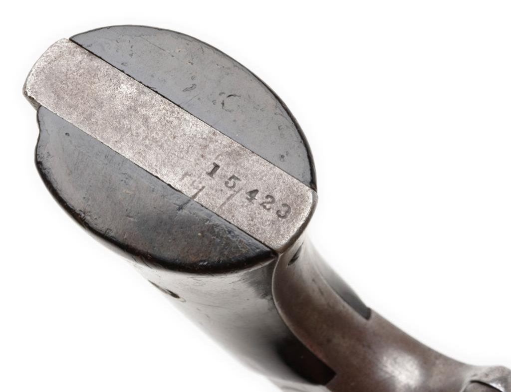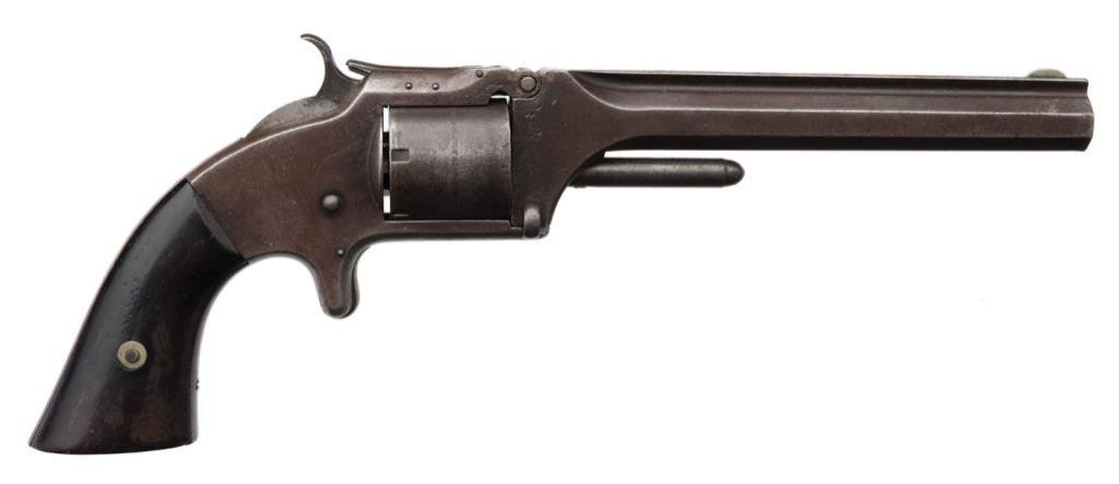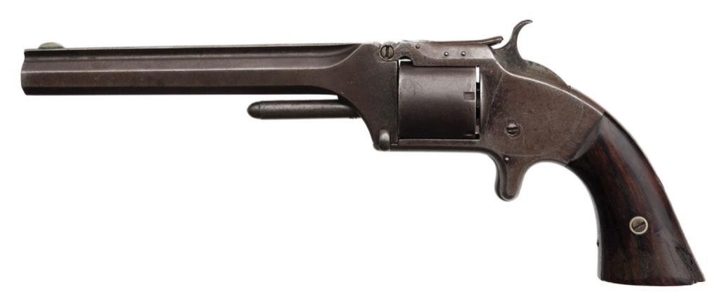 S&W #2 Army with early 3 pin variation, S/N 15423. Many early #2 .32 cal. revolvers shipped to Kentucky in Civil War. Traces of original blue mixed with patina. Some erosion and pin prick pitting. The grips are good other than a chip from the left heel. Good overall. Est.: $800-$1600