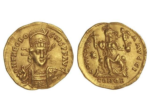 Sólido. - 408-450 d.C. - TEODOSIO. - CONSTANTINOPLA. - Anv.: D. N. THEODOSIVS P. F. AVG. Busto de frente acorazado y con casco, portando lanza y escudo. Rev.: CONCORDIA AVGGA. Constantinopla sentada a derecha, portando cetro y globo. En exergo: CONOB. 4,40 grs. AU. S-2. EBC-. - -