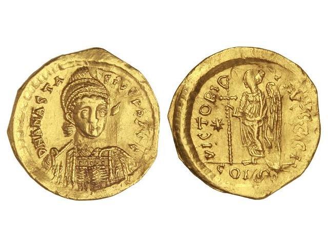 Sólido. - ANASTASIO (491-518). - CONSTANTINOPLA. - Anv.: D. N. ANASTASIVS PERP. AVG. Busto de frente acorazado y con casco, portando lanza y escudo. Rev.: VICTORIA AVGGG. Victoria de pie con cetro XP (superpuestas) invertida a izquierda, estrella en campo, debajo CONOB. AU. Se-5. MBC+. - -