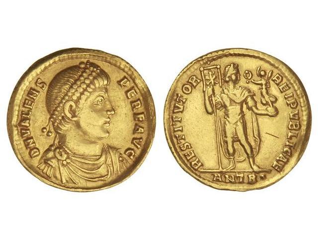 Sólido. - Acuñada el 364-367 d.C. - VALENTE. - ANTIOQUÍA. - Anv.: D. N. VALENS PER. F. AVG. Busto con coraza y diadema a derecha. Rev.: RESTITVTOR REIPVBLICAE. En exergo: ANTB. Valente estante con lábaro y Victoria. 4,30 grs. AU. (Rayitas). C-35. MBC+. - -