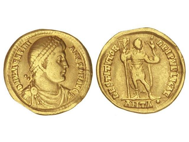 Sólido. Acuñada el 364-367 d.C. VALENTINIANO. Anv.: D. N. VALENTINIANVS P. F. AVG. Busto a derecha con coraza y diadema. Rev.: RESTITVTOR REI PVBLICAE. En exergo: ANT¶. Valentiniano de frente, portando lábaro y Victoria. 4,264 grs. AU