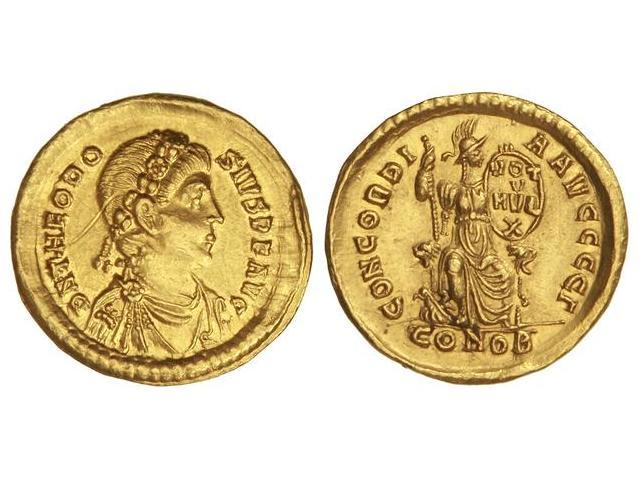 Sólido. Acuñada el 378-383 d.C. TEODOSIO I. Anv.: D. N. THEODOSIVS P. F. AVG. Busto con coraza y daidema a derecha. Rev.: CONCORDIA AVGGGG¶. En exergo: CONOB. Constantinopla sentada de frente cabeza a derecha, con cetro y escudo inscr