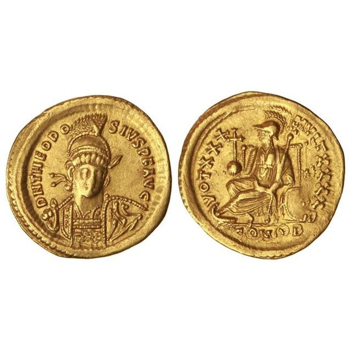 Sólido. Acuñada el 430-439 d.C. TEODOSIO II. CONSTANTINOPLA. Anv.: D. N. THEODOSIVS P. F. AVG. Busto de frente con casco, portando lanza y escudo. Rev.: VOT. XXX MVLT. XXXX. Constantinopla sentada a izquierda, portando cetro y globo crucífero, detrás escudo. 4,43 grs. AU. (Algo repintada en reverso). S-14. EBC-.