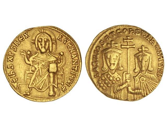 Sólido. - BASILIO I (867-886). - Anv.: ¶IHS XPS REX REGNANTI¶M. Cristo entronizado. Rev.: BASILIOS ET CONSTANT. AVGG. B. Basilio y Constante de frente, entre ellos cruz patriarcal. 4,30 grs. AU. Se-1704. MBC+. - -