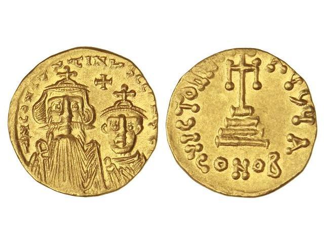 Sólido. CONSTANTE II (641-668). CONSTANTINOPLA. Anv.: ¶N. CONSTANTIN¶S C. CONSTAN. Busto de frente de Constante y Constantino IV. Rev.: VICTORIA AVG¶A. Cruz sobre tres escalones. En exergo: CONOB. 4,50 grs. AU. (Restos de brillo origi