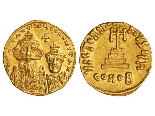 Sólido. CONSTANTE II (641-668). CONSTANTINOPLA. Anv.: ¶. N. CONSTANTIN¶S C. CONSTAN. Bustos de frente de Constante y Constantino II. Rev.: VICTORIA AV¶h. Cruz sobre tres escaloes. En exergo: CONOB. AU. Se-959. EBC-/MBC+.