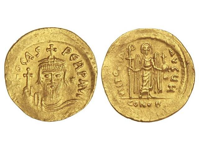 Sólido. FOCAS (602-610). CONSTANTINOPLA. Anv.: ¶. N. FOCAS PERP. AVG. Busto acorazado y coronado de frente. Rev.: VICTORIA AV¶A. Ángel de pie de frente. En exergo: CONOB. En campo: N. AU. (Rayuas). Se-621. MBC+.